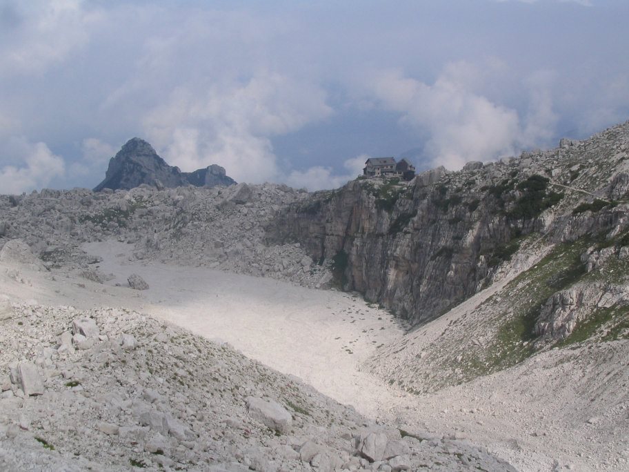 Hier ist die Alimonta-Hütte bereits zu sehen. Sie wurde in einem tollen Felsenkessel neu gebaut und wird privat geführt.
