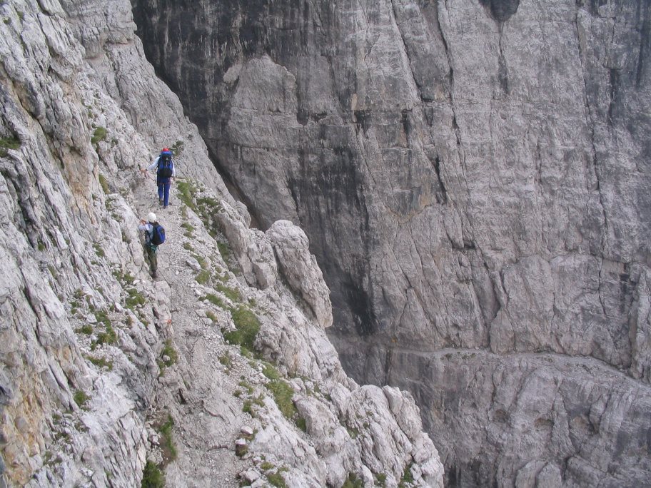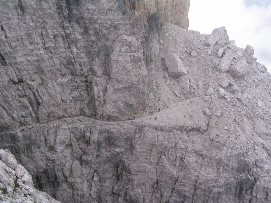 Der Weg verläuft weiter rechts durch die Felswand. Unten rechts ist die Fortsetzung des Wegs zu sehen. Wer genau hinsieht kann auch eine Leiter erkennen. Im letzten Stück war die Leiter etwas überhängend. Dies war mit unserem Gepäck sehr anstrengend.