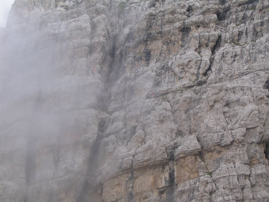 Zwei uns nachfolgende Wanderer sind auf dem Bild in der Mitte im Nebel erkennbar. Auf dem Foto sieht der Weg komplizierter aus, als er war. Es gab immer eine Sicherung und auch ausreichend Griffe und Tritte.