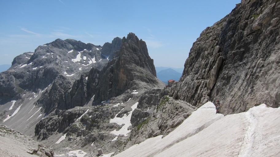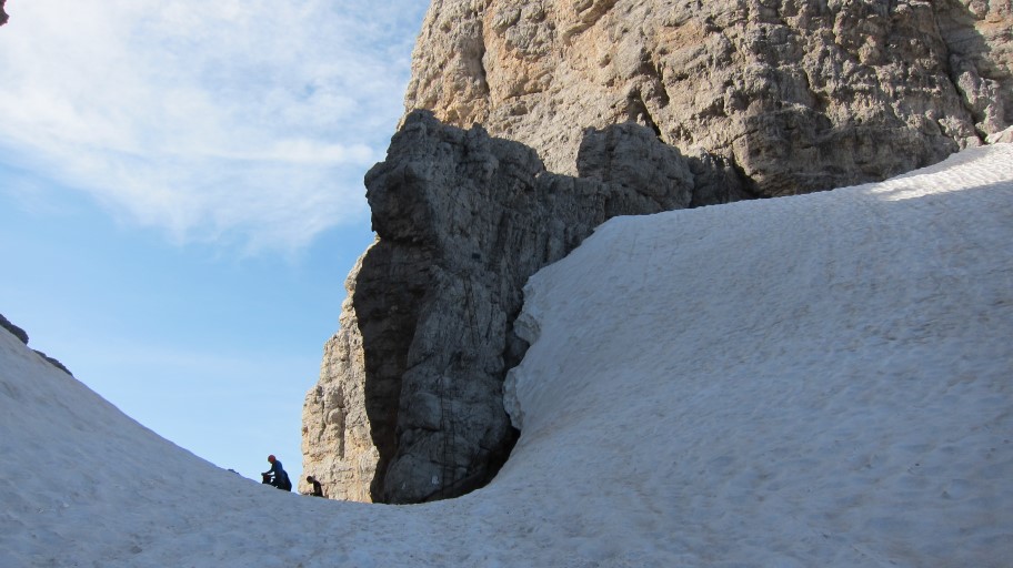 Kurz nach der Bocca di Brenta (2552 m) queren wir ein letztes Schneefeld und erreichen unser heutiges Ziel, die Pedrotti Hütte (2491 m), die im Hintergrund bereits sichtbar ist.