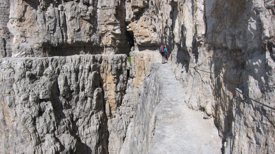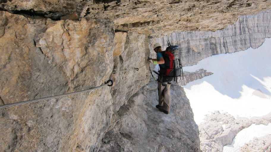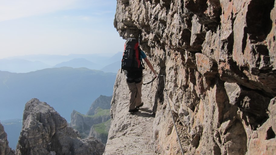 Charakteristisch für diesen Klettersteig sind die schmalen Felsbänder.