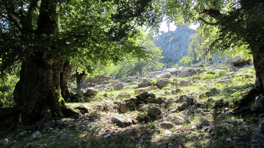 Nach der Bocca Palmente (1640 m) ging es vorbei an wieder hergerichteten alten Häuschen auf nahezu einer Höhe für ca. 1 Stunde durch Wald und Wiesen.