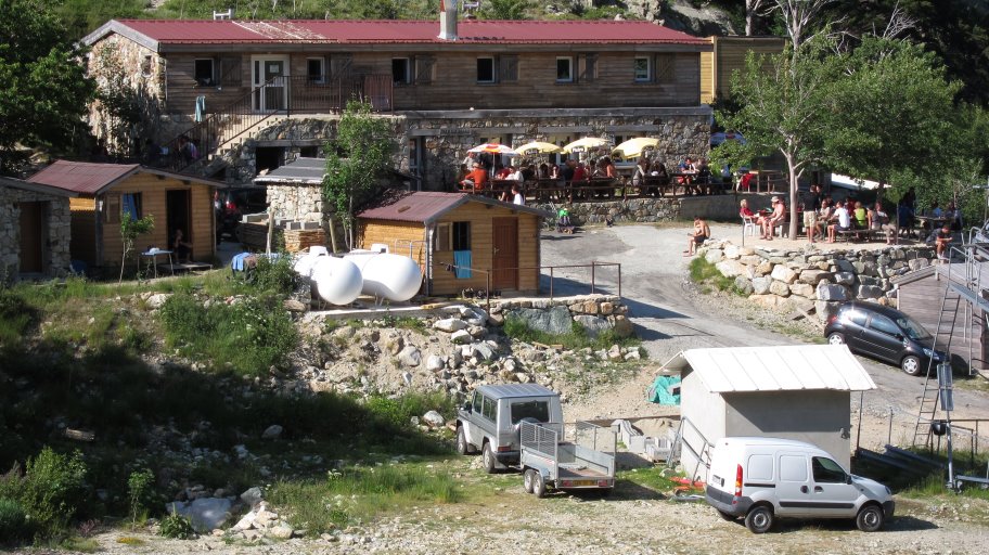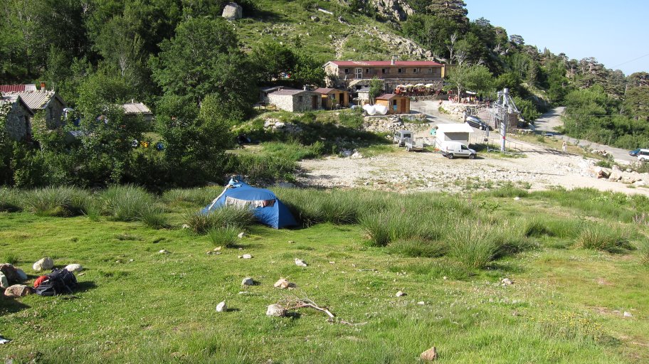 Das Gelände war hier nicht ganz eben, so dass es nicht viele brauchbare Campingplätze gab. Geplant hatte ich hier mir ein Abendessen zu bestellen. Aber da ich auf Grund des Busfahrt erst relativ spät die Tour beginnen konnte, kam ich zu spät an. Da waren alle Essen bereits ausverkauft bzw. reserviert. Die Kapazitäten der Küche waren eben begrenzt und sehr Viele unterwegs. Zum Glück konnte ich mir dort noch ein Fertiggericht kaufen welches ich mir dann auf meinem Kocher warm gemacht habe. Für den Südteil hatte ich mir vorgenommen öfters Essen zu gehen und hatte mich beim Einkaufen in Corte doch stark zurückgehalten.