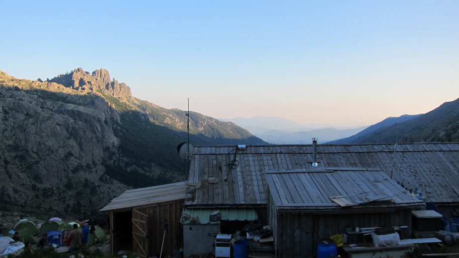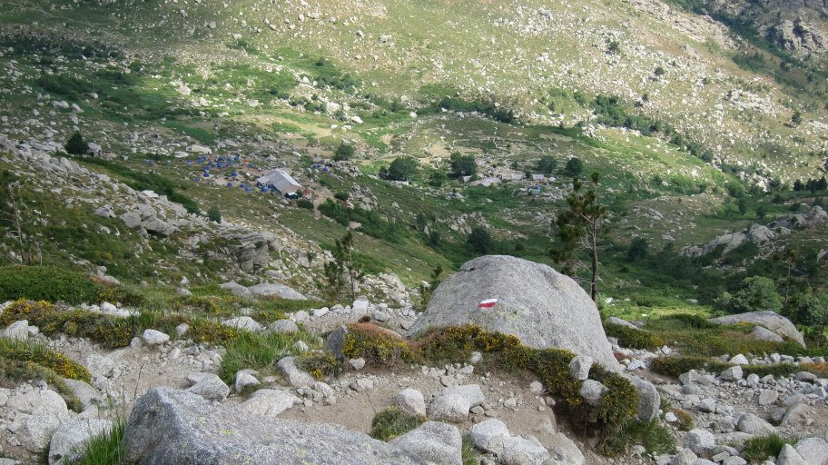 Hier ist dann mein Etappenziel, die Hütte Asinau, schon deutlich zu sehen. Der größte Teil der blauen Zelte um dir Hütte sind Mietzelte. Zusätzlich zu den GR20 Wandereren übernachten hier auch einige Kurzwanderer, die vom Col de Bavella kamen. Hier musste ich fast eine Stunde warten bis die kalte Dusche frei war.
