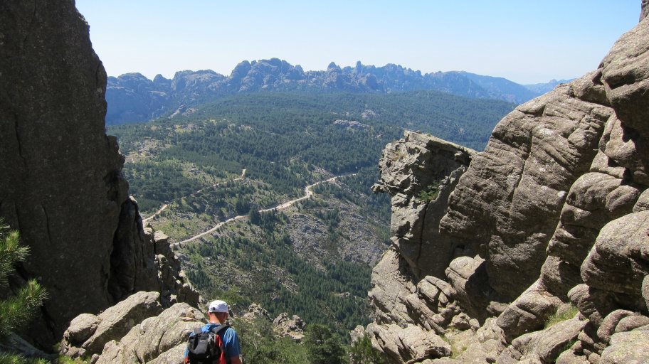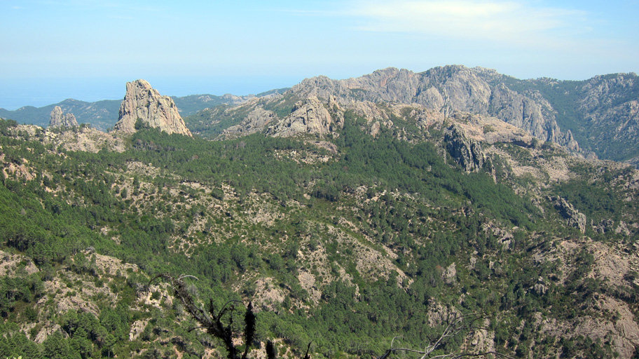 Vom Kamm der Bavella, höchster Punkt ist hier 1680 m hoch, ist die nächste Bergkette gut zu sehen. Hinter dieser verbirgt sich das heutige Etappenziel.