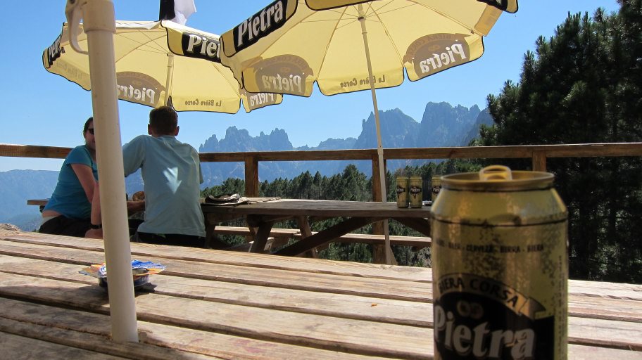 Ein schöner Blick von der Trasse der Refuge mit dem obligatorischen Bier zum durstlöschen im Vordergrund. Abends habe ich gut gegessen und korsischen Rotwein getrunken. Dieser war nur abgefüllt in einer 0,7 l Flasche für 7 € zu bekommen. Die Nacht habe ich sehr gut geschlafen. Dies war schon ein wenig Abschied von der Tour.