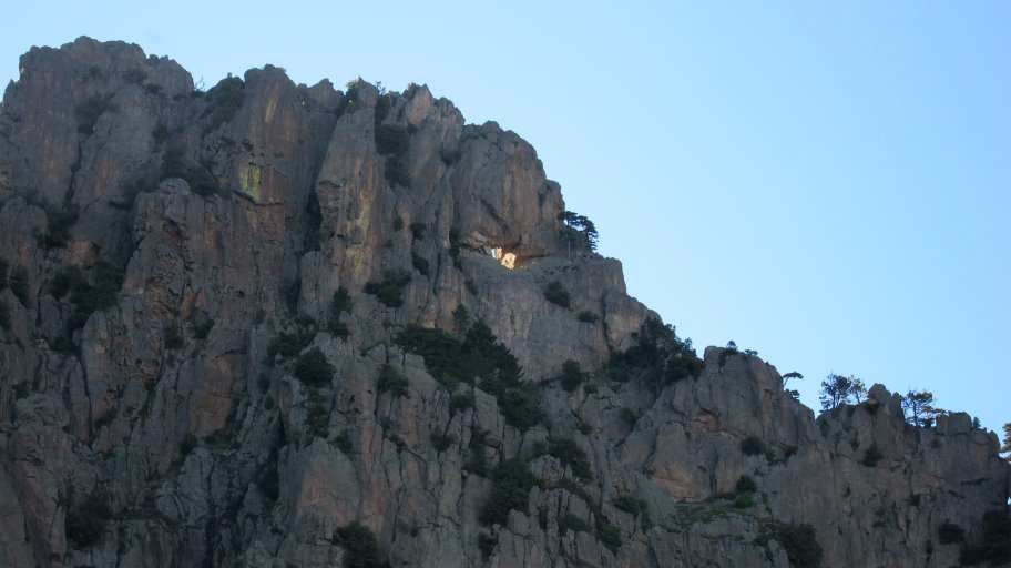 Die Abendsonne scheint hier duch ein Loch im Felsen. Dieses Massiv konnte ich direkt vom Zelt aus sehen.