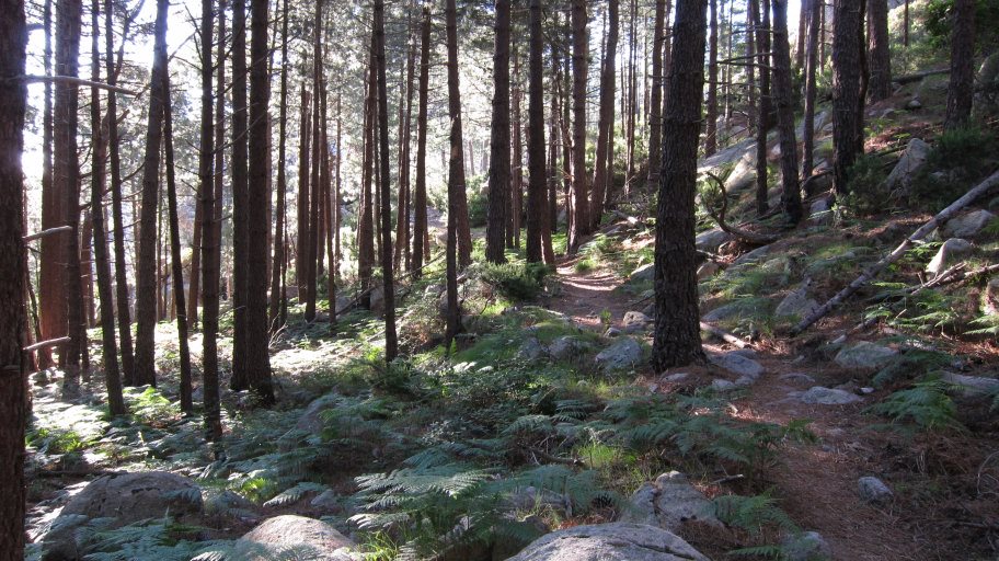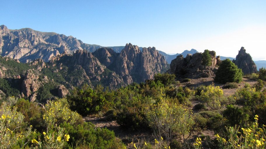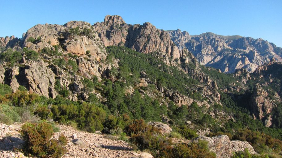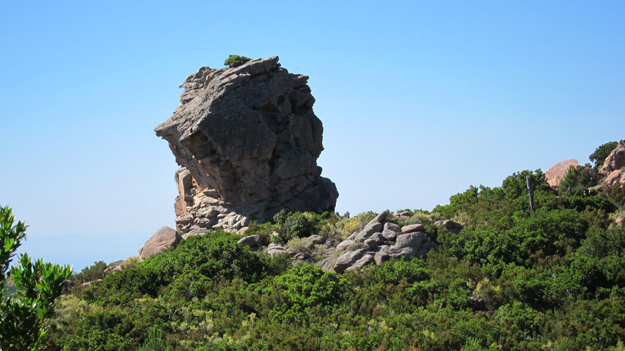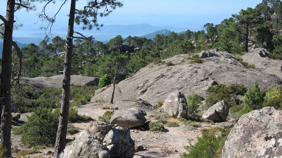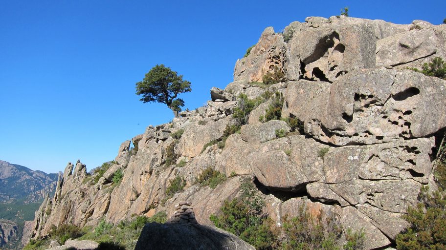 Im Süden von Korsika sehen die Felsen etwas rundlicher aus als im Norden. Dies ist hier gut zu sehen. Hier sehe die Steine fast wie Sandstein aus. Unten kommt das Meer immer näher. Dies ist mein heutiges Ziel. Aber noch ein weiter Weg.