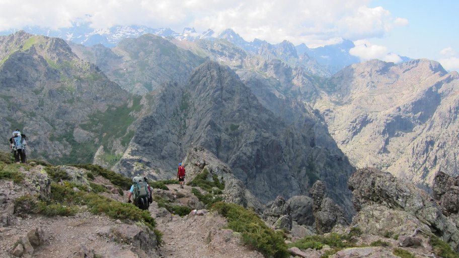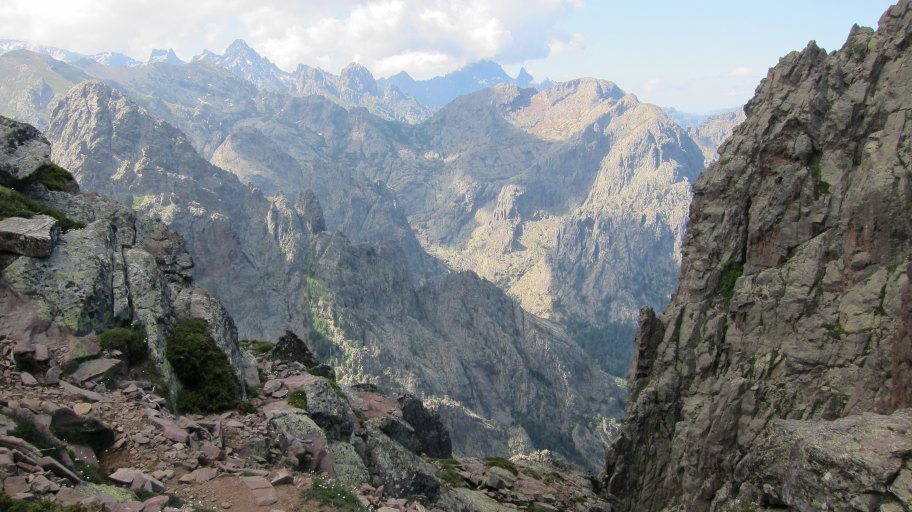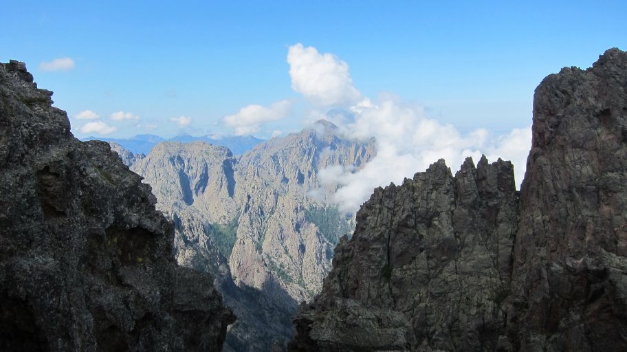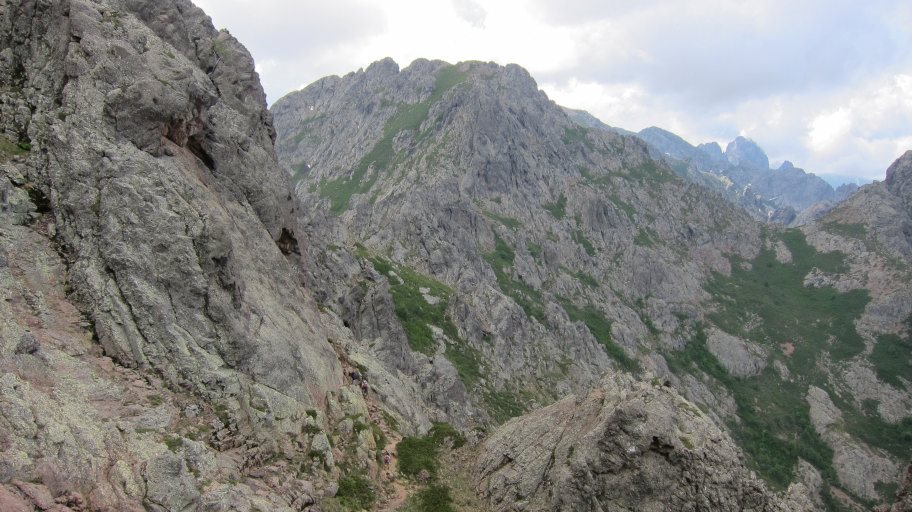 Oben ging es dann immer auf und ab durchsetzt mit leichten Kletterpassagen, die durch den schweren Rucksack viel Aufmerksamkeit verlangten. Immer wieder gab es tolle Ausblicke auf wilde Felsgebilde, die ich so nicht von Korsika erwartet hatte.
