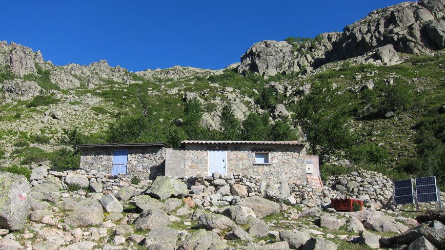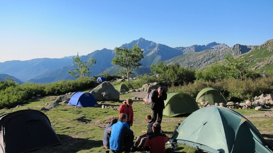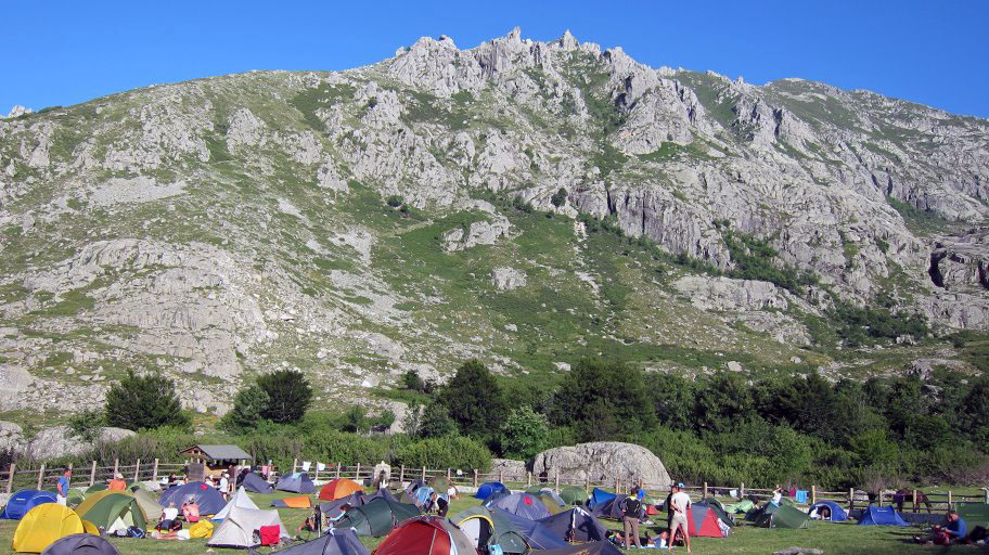 Die Hütte I'Onda und die gleichnamige Bergerie haben den gleichen Betreiber. Unterhalb der Bergerie gab es einen bequemen Platz zum Zelten. Im Hintergrund ist die Kochstelle zu sehen. Der Zeltplatz war eingezäunt, da hier die Ziegen frei herum liefen. Dieser Zeltplatz war sehr gut ausgelastet.