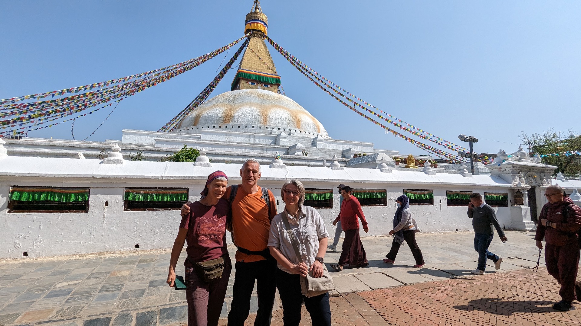 Auf dem Boudhanath: Nach dem Erdbeben 2015 war alles oberhalb der Kuppel zerstört. Nach der Restaurierung ist davon nichts mehr zu sehen, alles strahlt wieder.