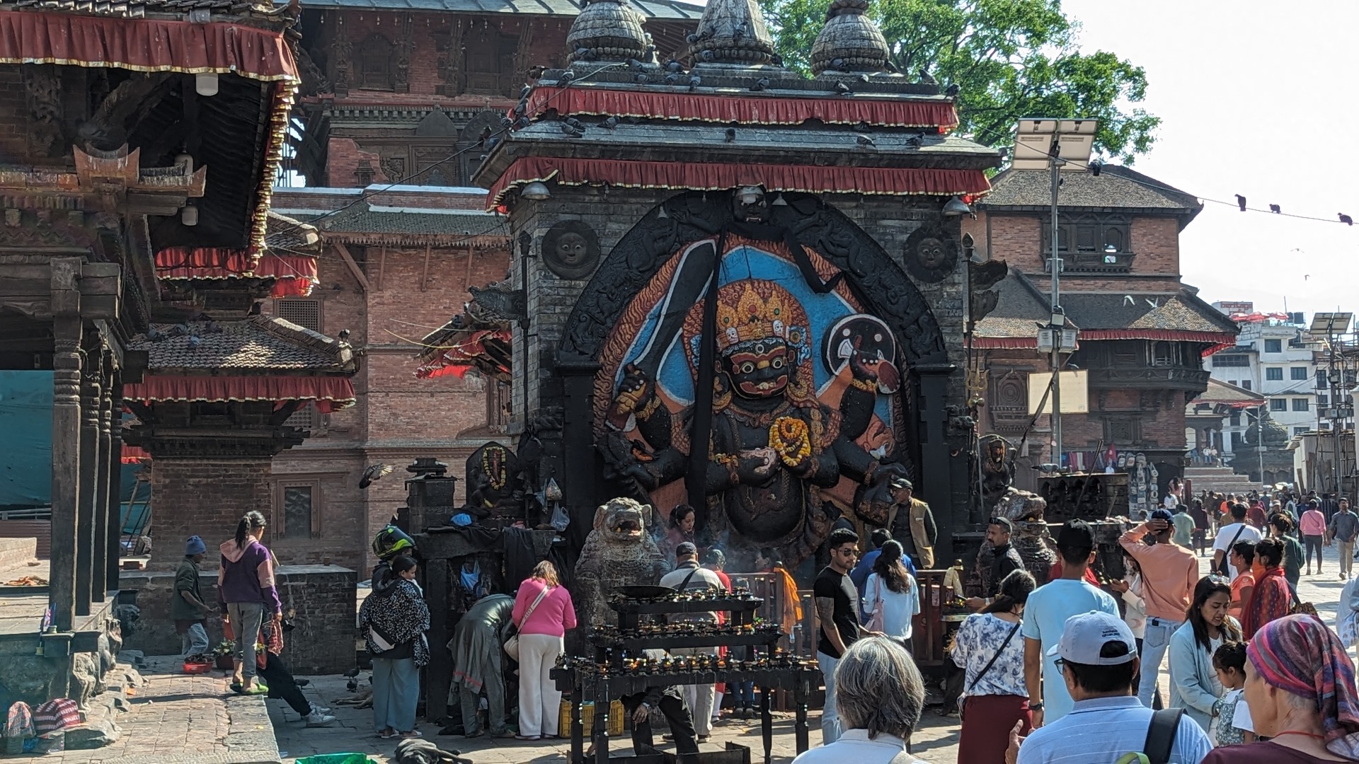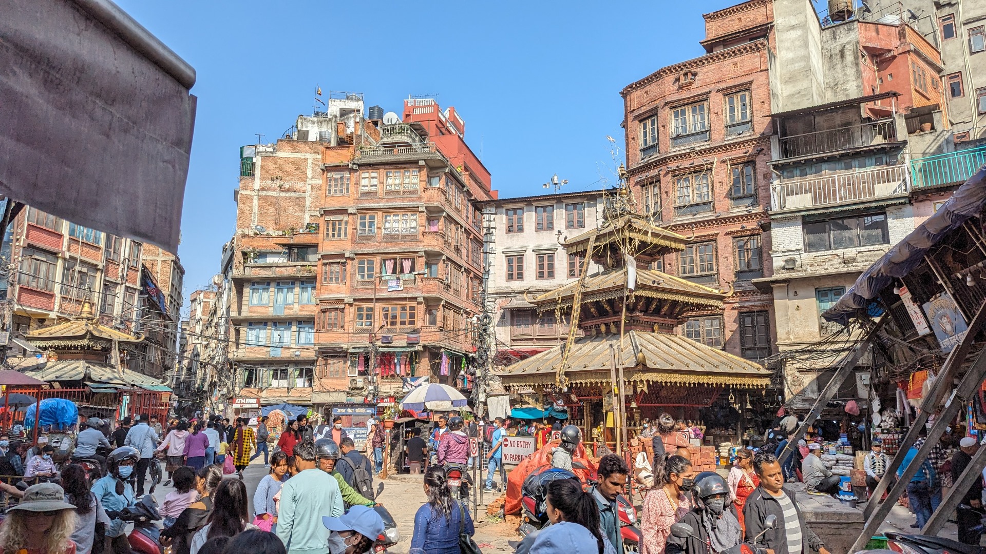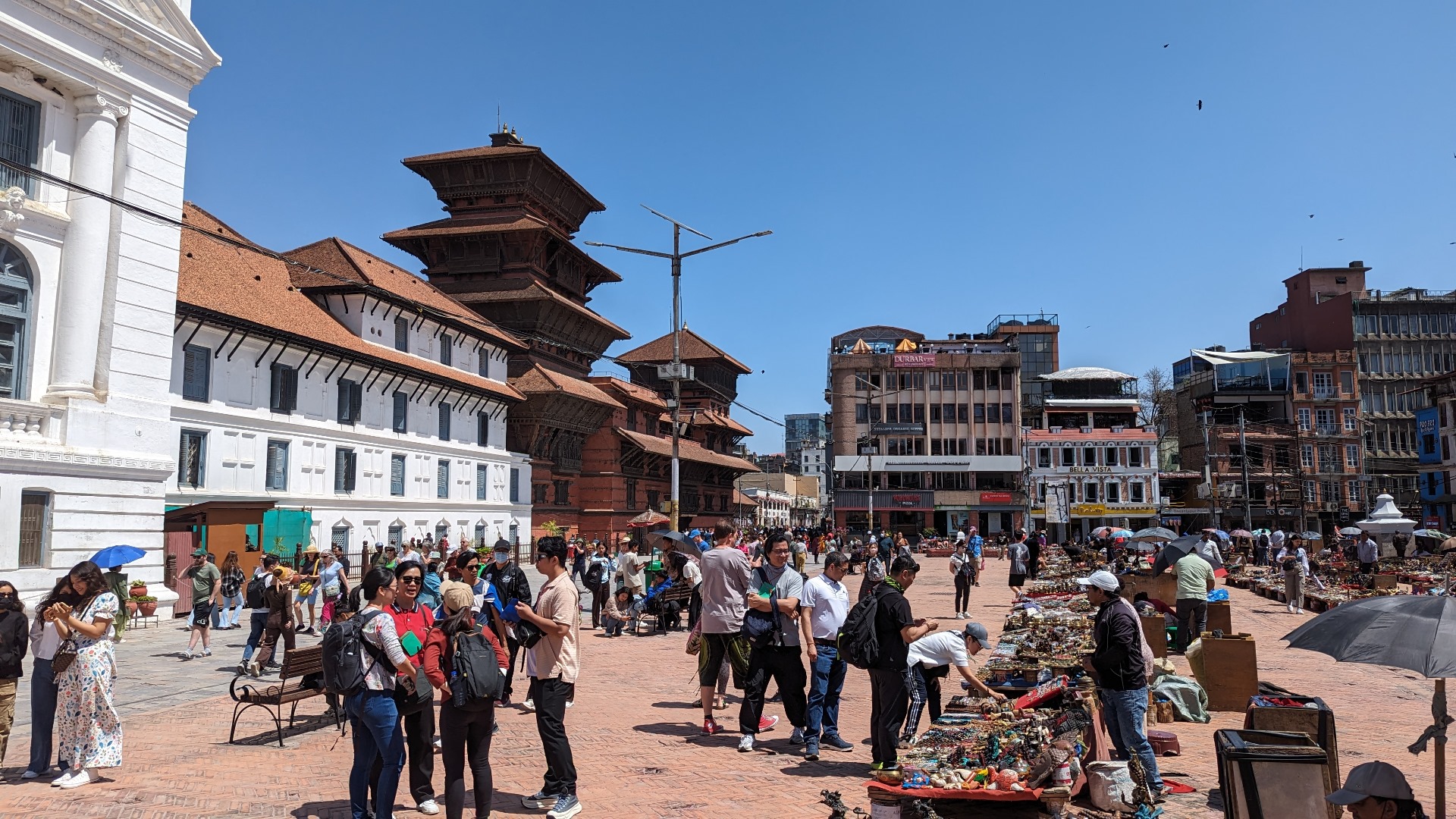 Durbar Square: Reges Markttreiben. Im Hintergrund ist ein Dachgarten zu sehen, dort haben wir unser Mittagsessen eingenommen und das Treiben auf dem Platz beobachtet.