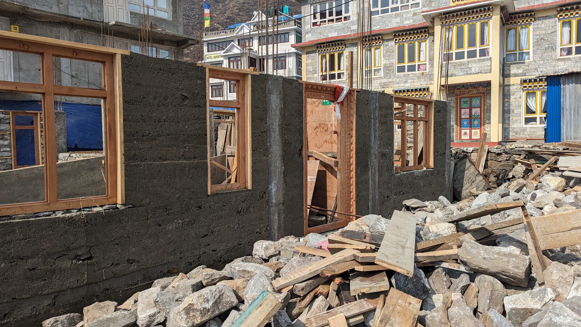 Typische nepalesische Baustelle. Es wird um die Fenster- und Türrahmen herum gemauert.