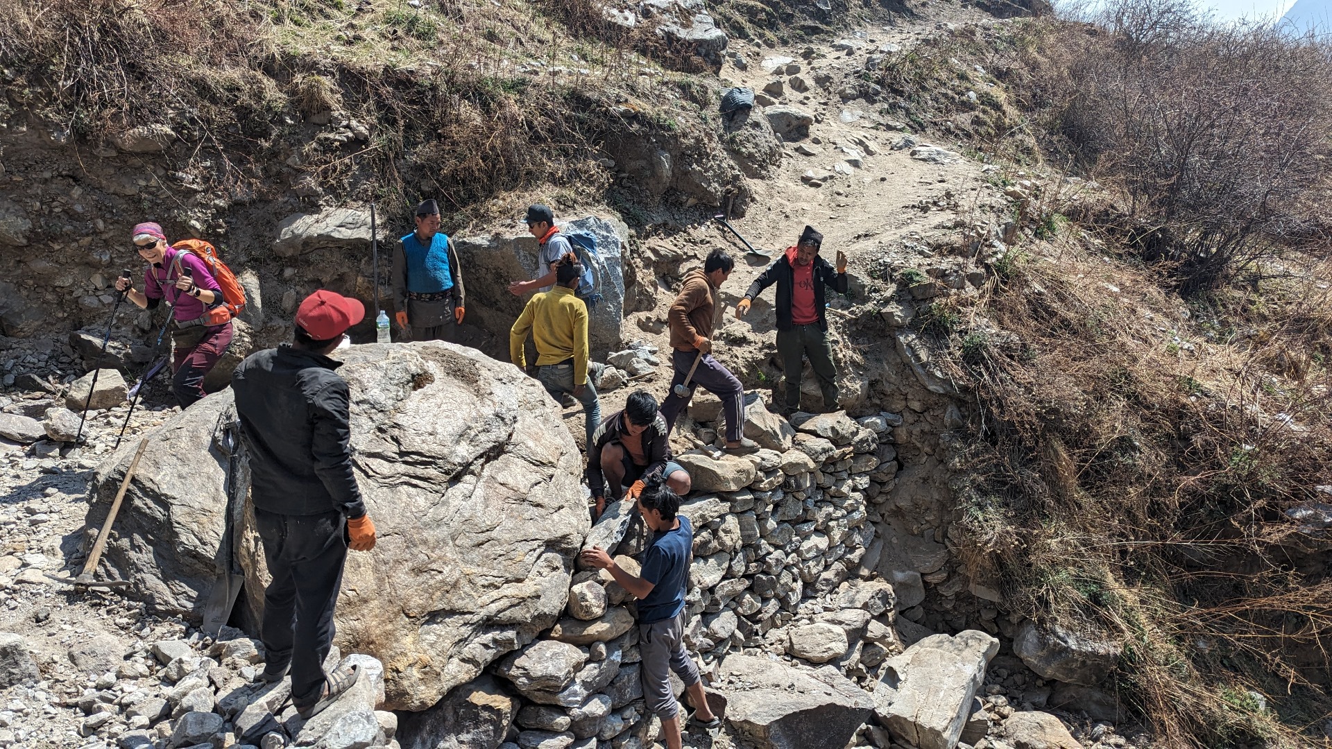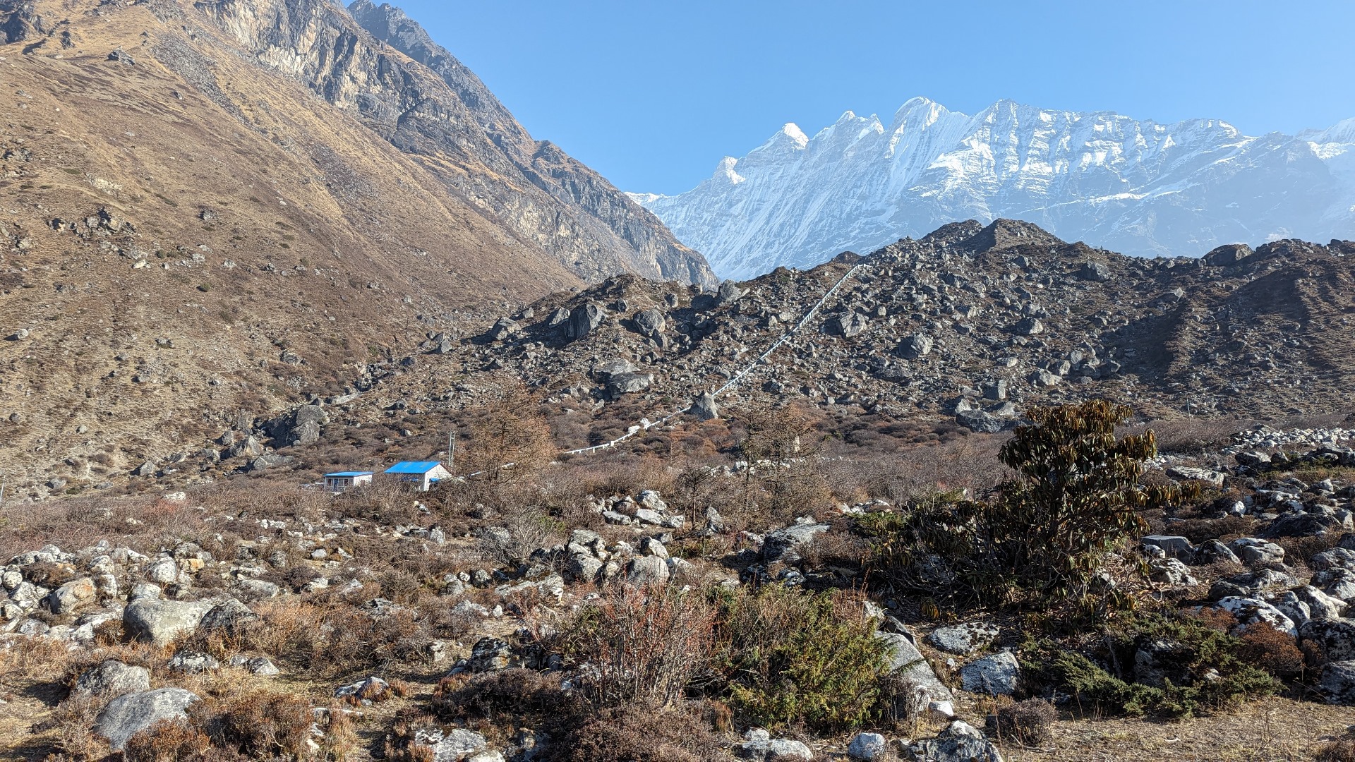 Es ist das kleine Wasserkraftwerk im Hintergrund zu sehen. Das Wasser kommt aus dem Gletschersee. Dieses Wasserkraftwerk versorgt den oberen Teil des Langtangtals mit Strom. Im Lama Hotel gab es keine Strom da zwischen Lama Hotel und Langtang die Stromleitung zerstört war.