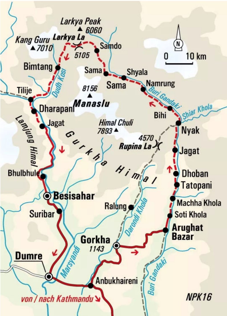 Wegverlauf: Soli Khola -> Maccha Khola -> Jagat -> Deng -> Namrung -> Shyala -> Samagaon -> Samdo -> Akklimatisierung -> Dharamsala -> Larkya La - Bimthang -> Tilije -> Tal -> Syange