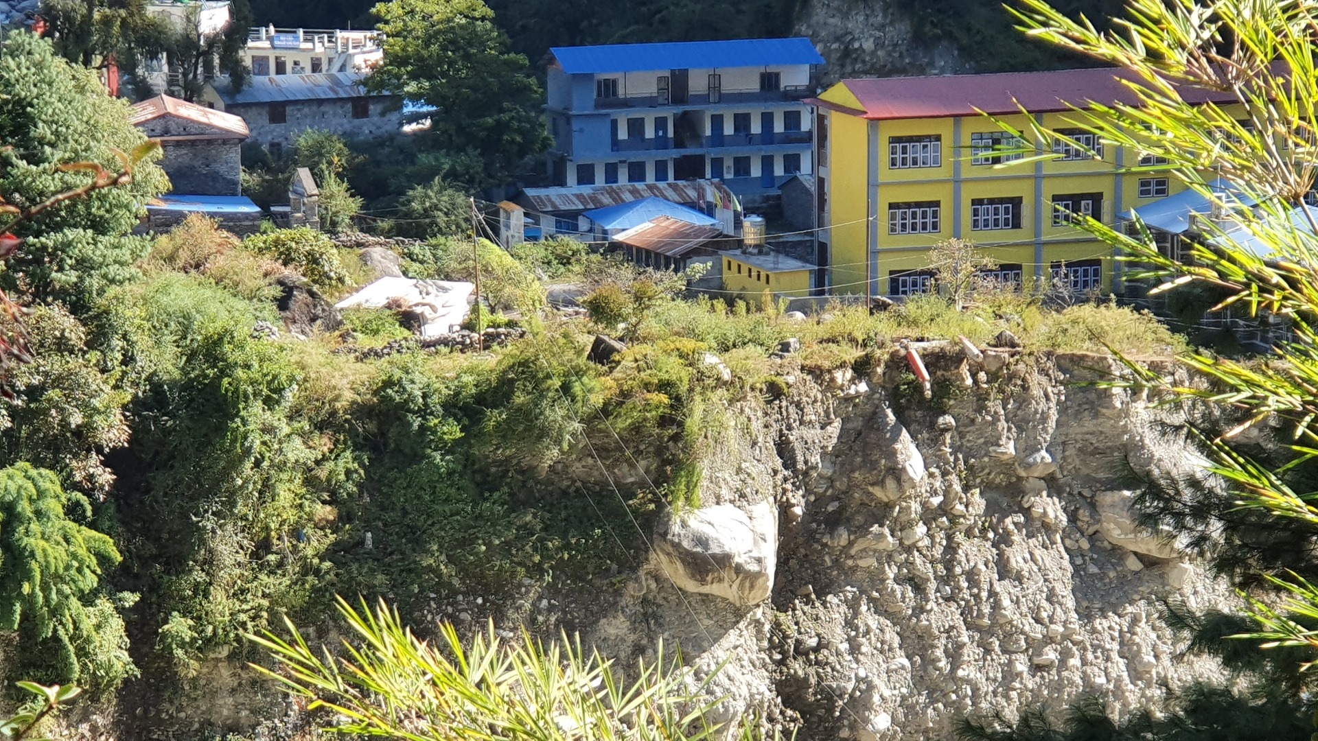 Blick auf Tal. Dieser Ort sah vor dem Hochwasser viel schöner aus. Einige Lodges wurde aber wieder aufgebaut. Die rechts am Bildrand zu sehende Lodge wurde dann unser Quartier. Auf unserer Annapurna Runde konnten wir auf dem Wanderweg auf der anderen Talseite gehen. Aber auch die Hängebrücke oberhalb von Tal wurde zerstört.