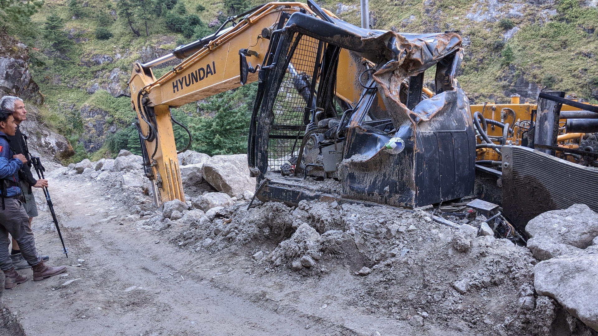 Dieser Bagger wurde Opfer eines Steinschlages und kann hier nicht mehr entfernt werden.