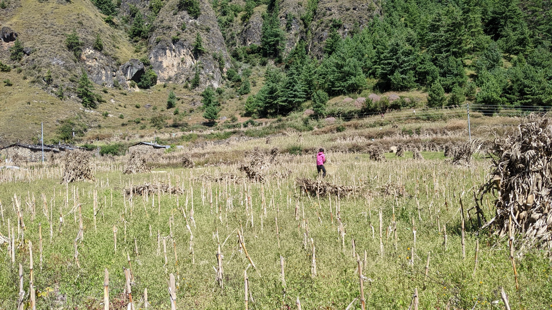 Dorfbewohner bei der Arbeit auf ihren Feldern. Es war gerade Erntezeit. Hier stand Mais.