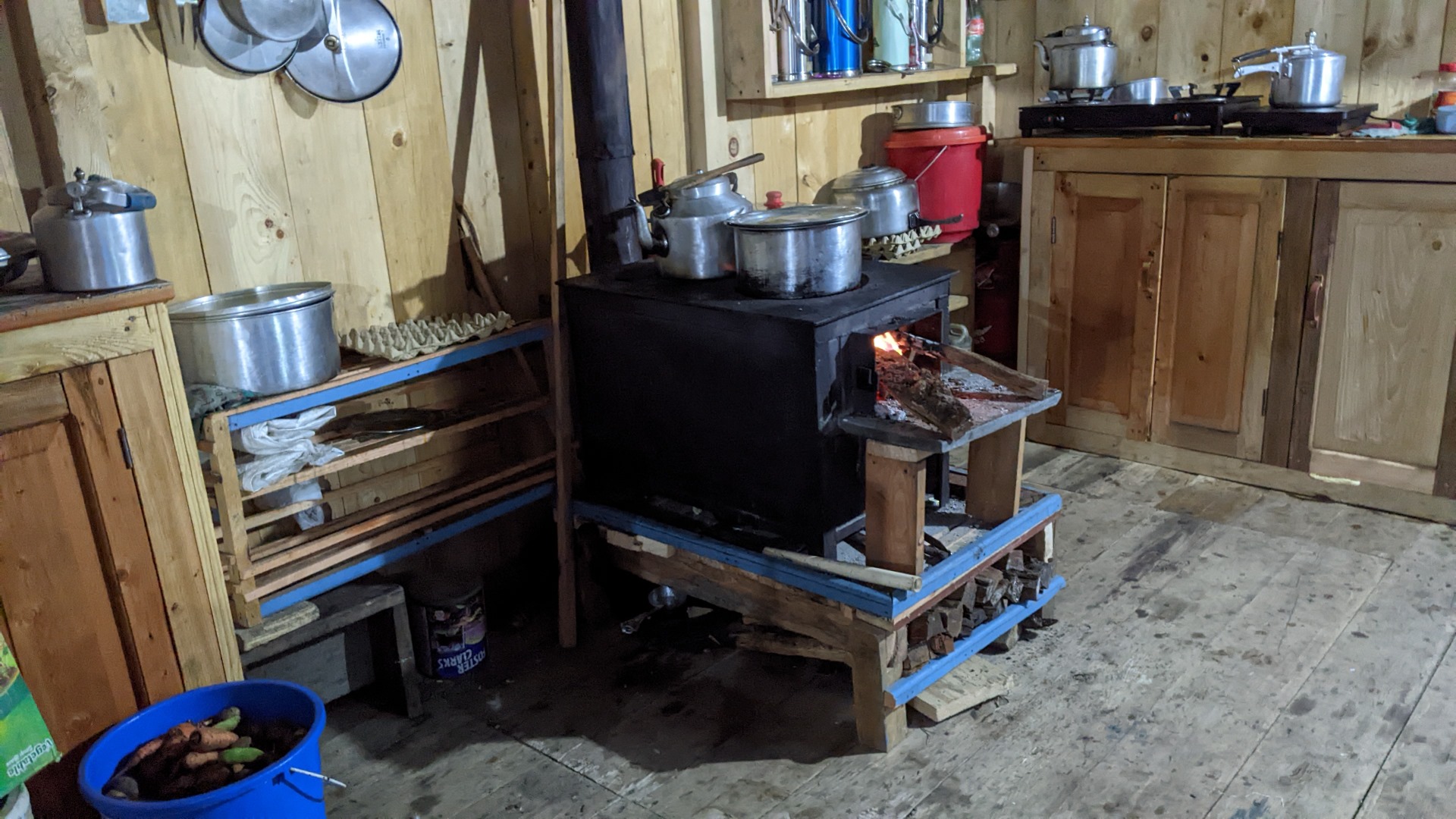 Blick in die Küche unserer Lodge. Man beachte die Ofenkonstruktion, in Deutschland undenkbar!