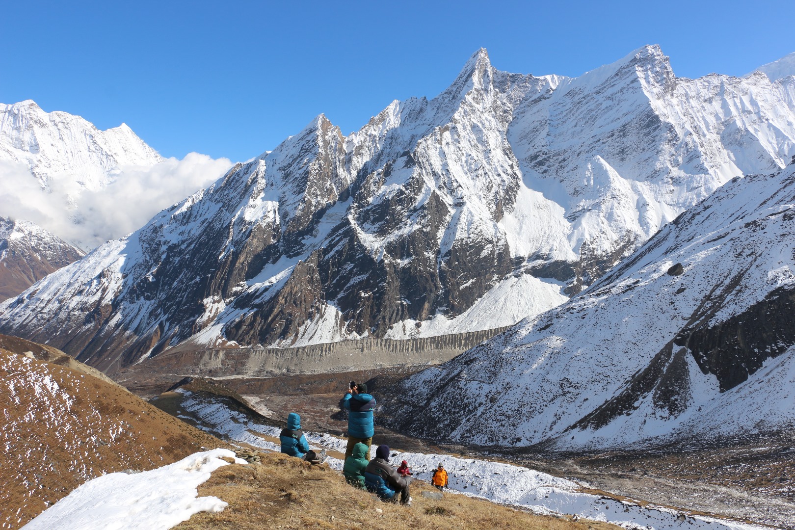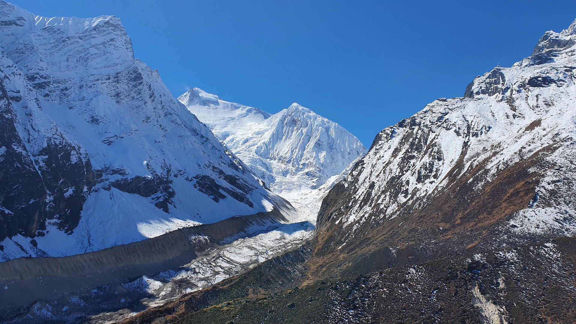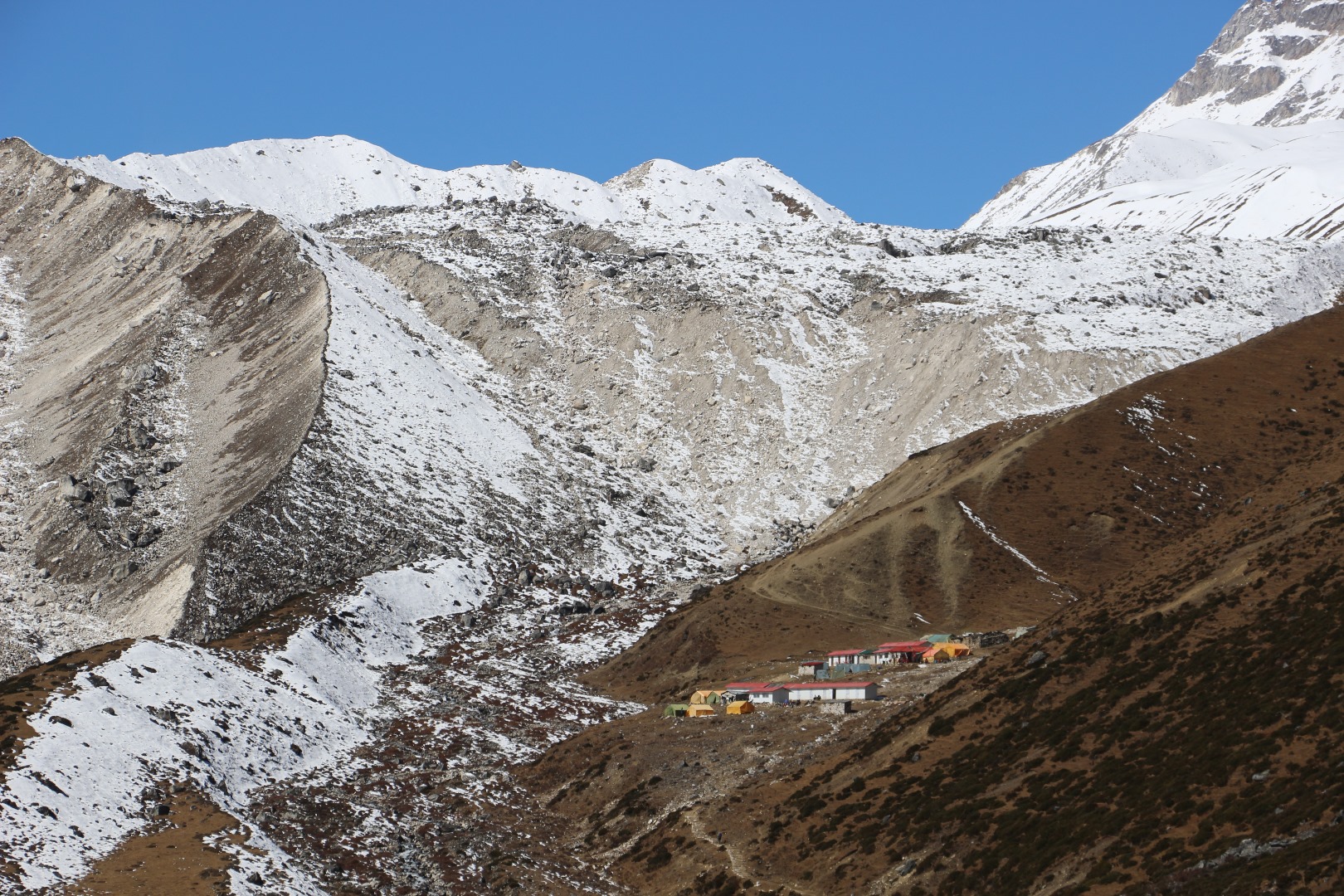 Von dem Gletscher im Tal ist auch nicht mehr viel übriggeblieben. Die Seitenmoränen zeigen recht deutlich den Rückgang.