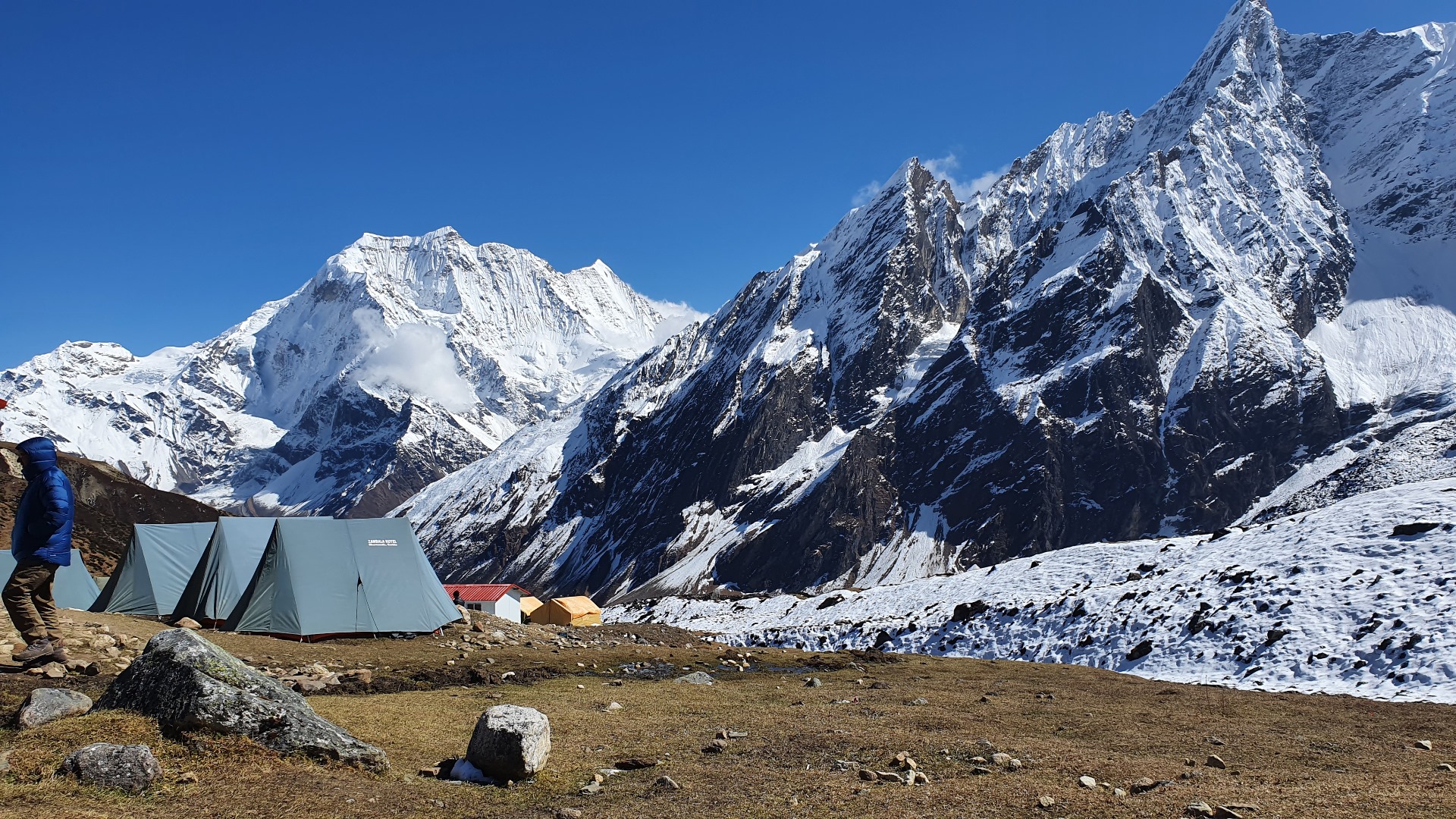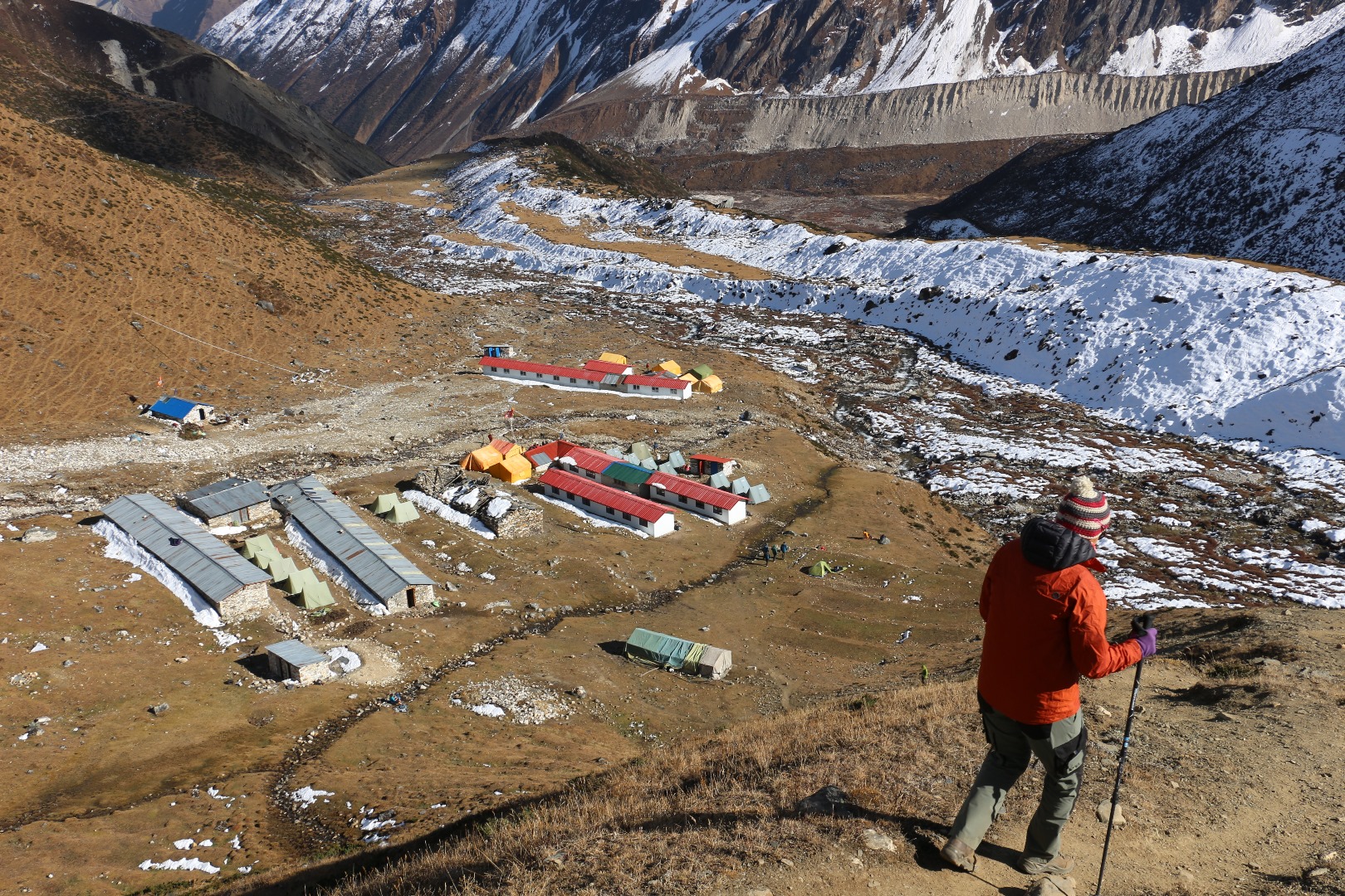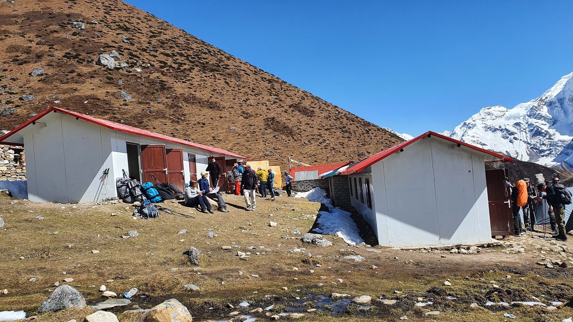 Die zu sehenden Gebäude gibt es noch nicht so lange. Früher waren hier nur Zelte aufgestellt. Heutzutage kann solange noch nicht alle Betten belegt sind, zwischen einer Übernachtung im Zelt oder in der Hütte gewählt werden. Hinter jeder Tür befinden sich hier 4 Lagerplätze.