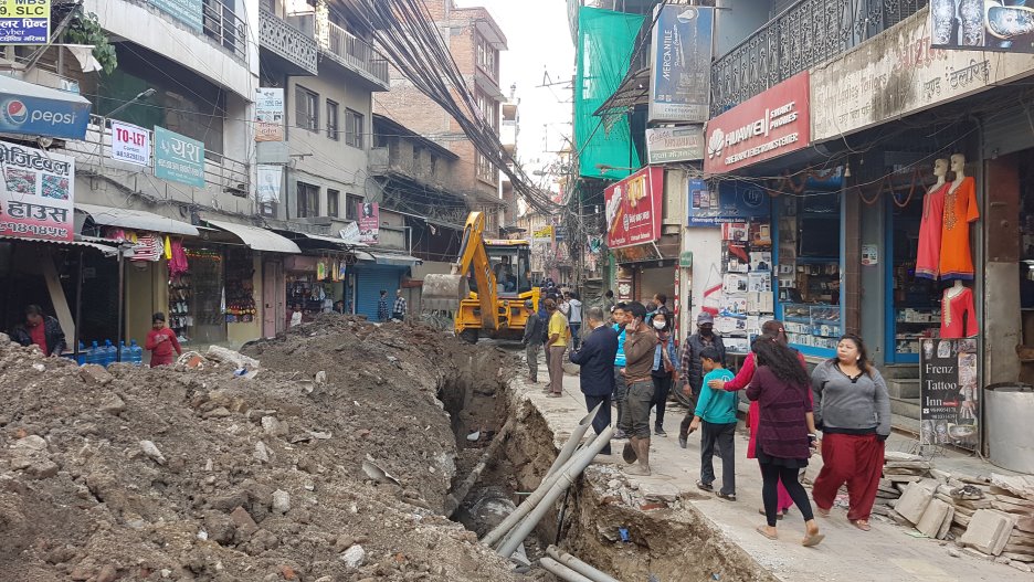 Baustellen in Kathmandu sind nicht mit unseren zu vergleichen. Auch wir hatten uns an dem Bagger vorbeigedrängt. Es ist recht aufwendig alle Schäden, die durch das Erdbeben entstanden sind, zu beseitigen.