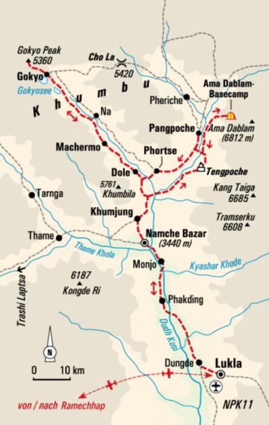 Der Wegverlauf: Lukla -> Phakding -> Namche Bazar -> Phortse Tenga -> Dohle -> Machhermo -> Gokyo -> Gokyo Ri -> Dragnag -> Machhermo -> Phortse -> Pangboche -> Debuche -> Namche Bazar -> Phakding -> Lukla