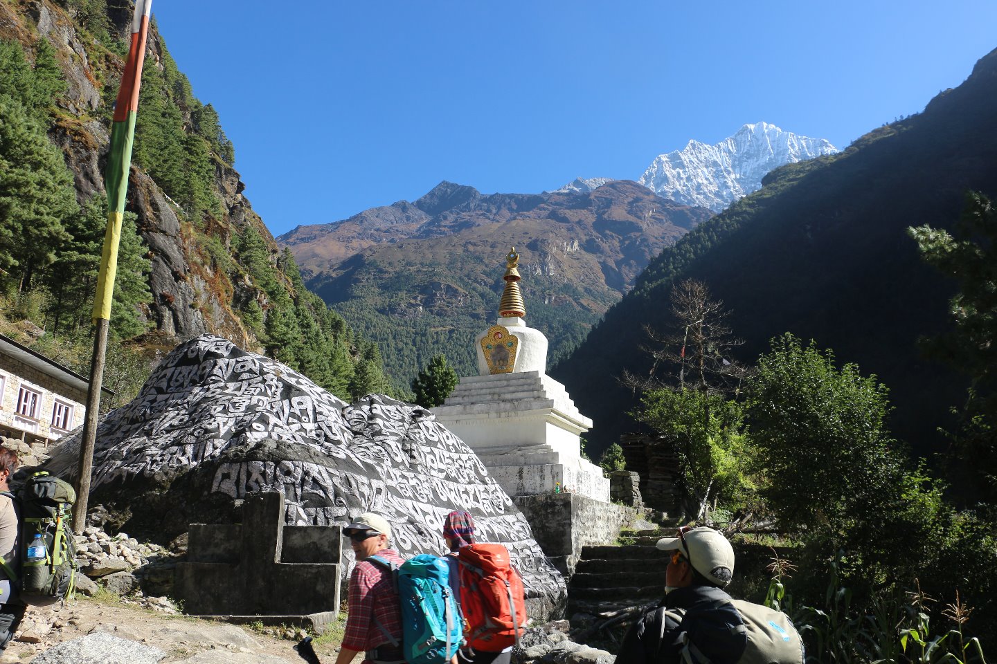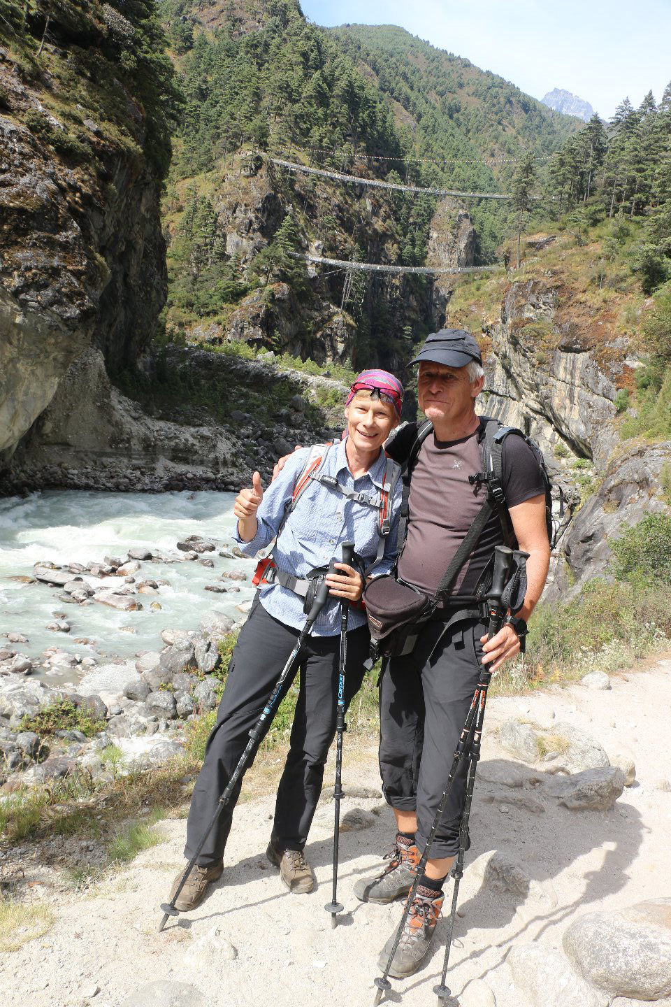 Im Hintergrund ist die berühmte Hillary Bridge zu sehen. Es ist die Untere der beiden Hängebrücken. Derzeit ist nur die obere, neue Brücke nutzbar, da der Weg auf der anderen Talseite für die untere Brücke zerstört ist und von den Lasttieren nicht mehr genutzt werden kann. Die neue Brücke ist 130 m lang und befindet sich in einer Höhe von 150 m über dem Fluss.