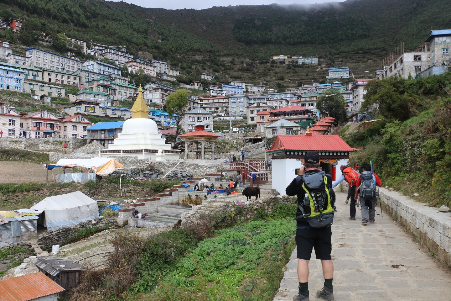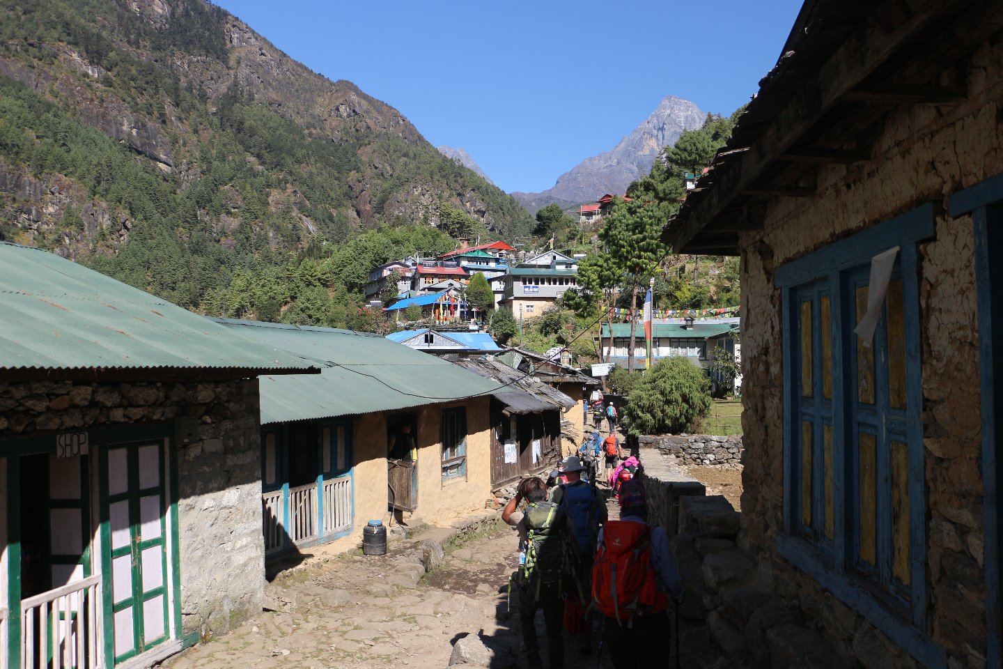 Endlich haben wir unser Tagesziel Namche Bazar, die sogenannte Sherpa Hauptstadt, erreicht. Unsere Lodge befand sich allerdings erst am Ausgang des Ortes weit oben.