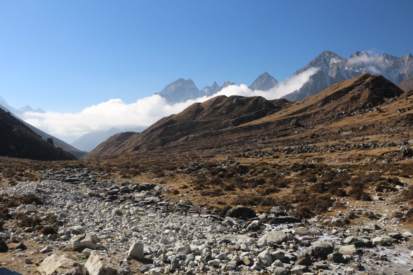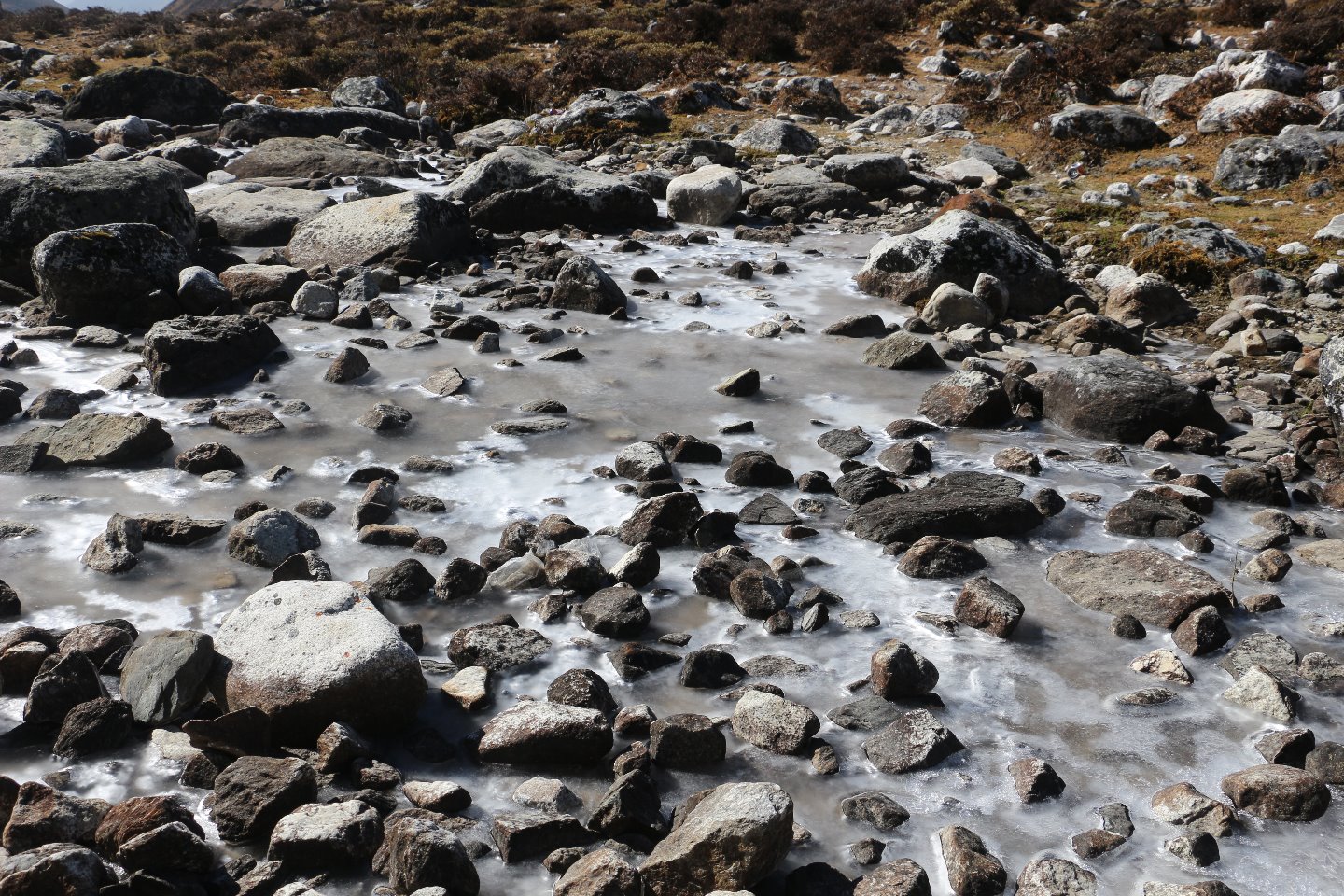 Es ist kaum vorstellbar, dass am Tag vorher dieser Bach noch munter vor sich hin floss und wir uns in ihm gewaschen hatten. Es wird nachts eben sehr kalt in diesen Höhen.