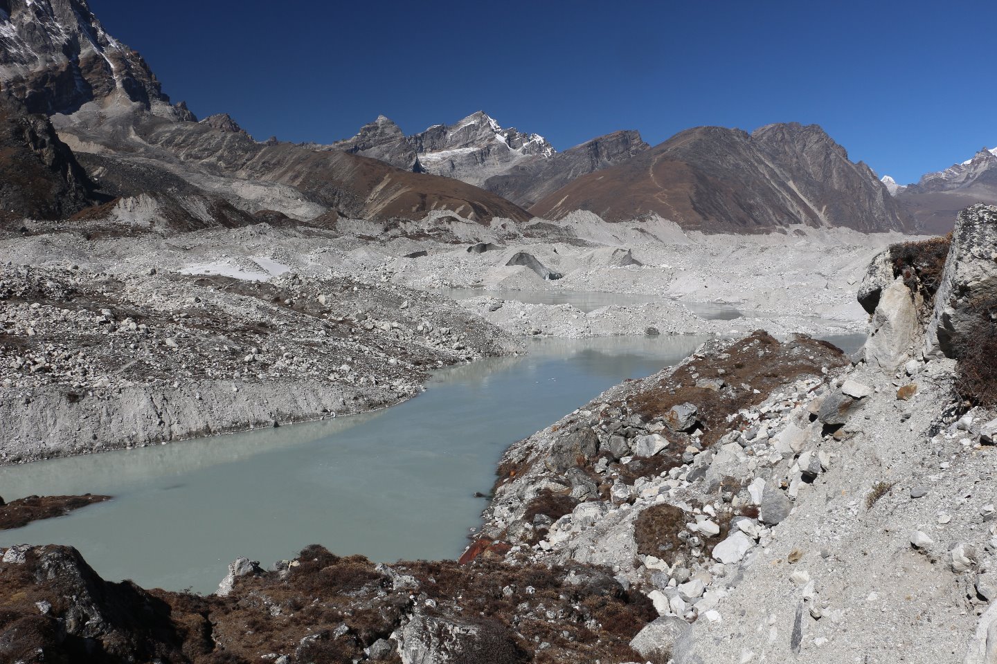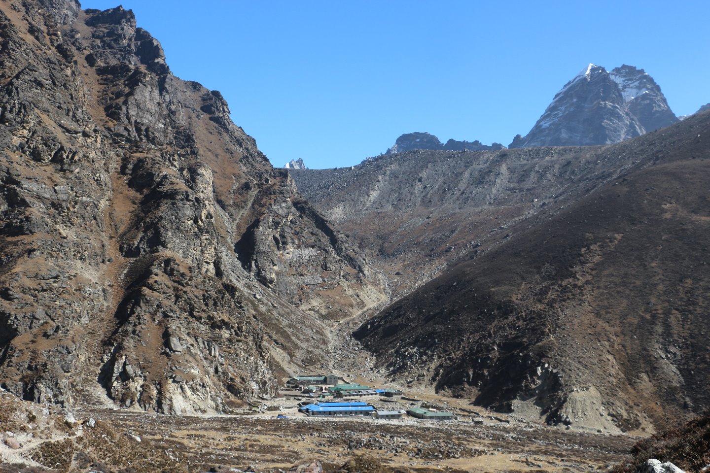 Von der Seitenmoräne ist gut die Lodge und dahinter der Weg Richtung Cho La Pass erkennbar.
