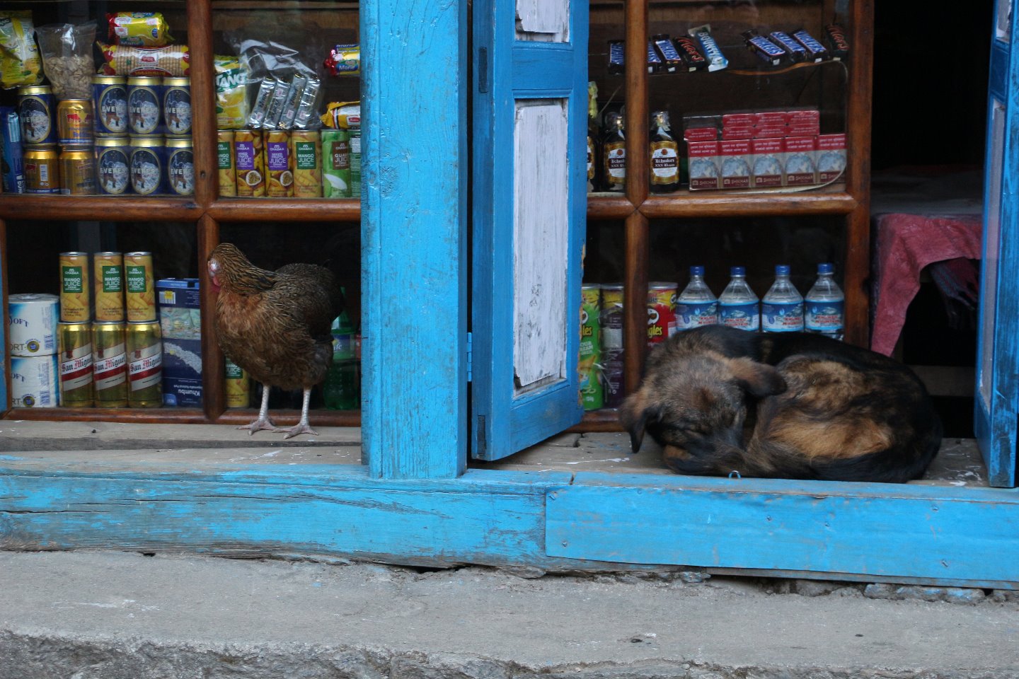 Ein idyllisches Bild: Huhn und Hund jeweils in einer Türöffnung des Ladens.