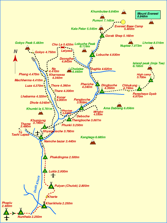 Wegverlauf: Lukla -> Phakding -> Namche Bazar -> Thame -> Khumjung -> Phortse -> Pangboche -> Ama Dablam BC -> Dingboche -> Lobuche -> Kala Pattar -> Gorakshep -> Everest BC -> Thukla -> Chukhung -> Chukhung Ri -> Pangboche -> Namche Bazar -> Phakding -> Lukla