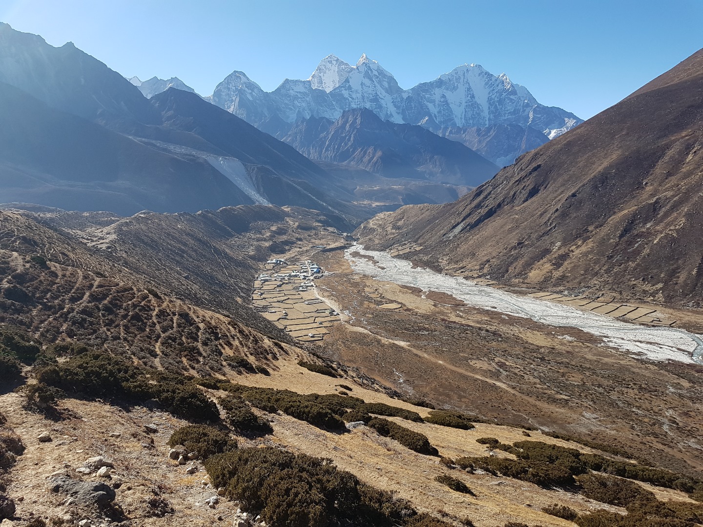 Unten im Tal liegt Periche (4240 m). Wir hatten für die Übernachtung das besser gelegene Dingboche (4410 m) gewählt.