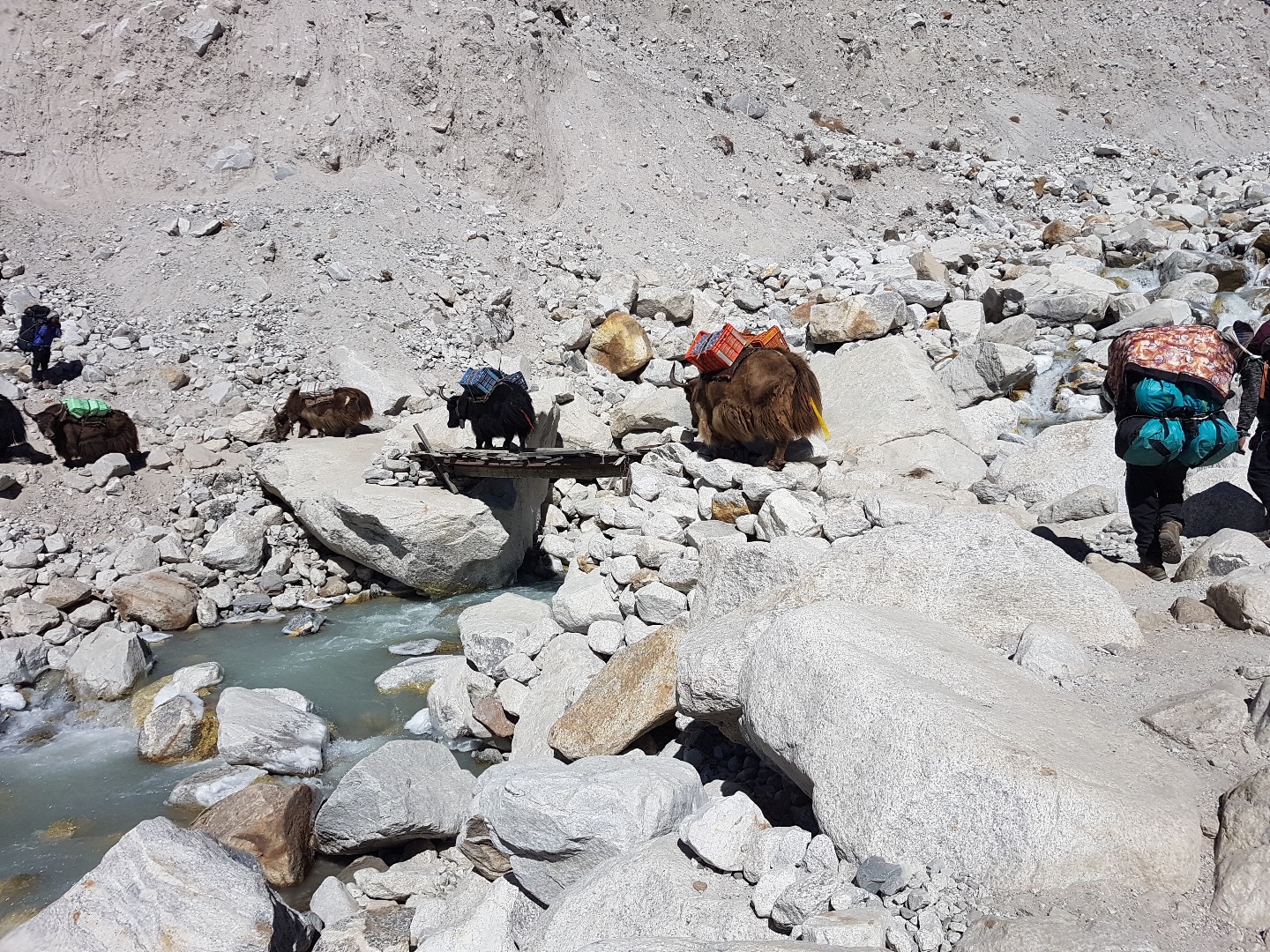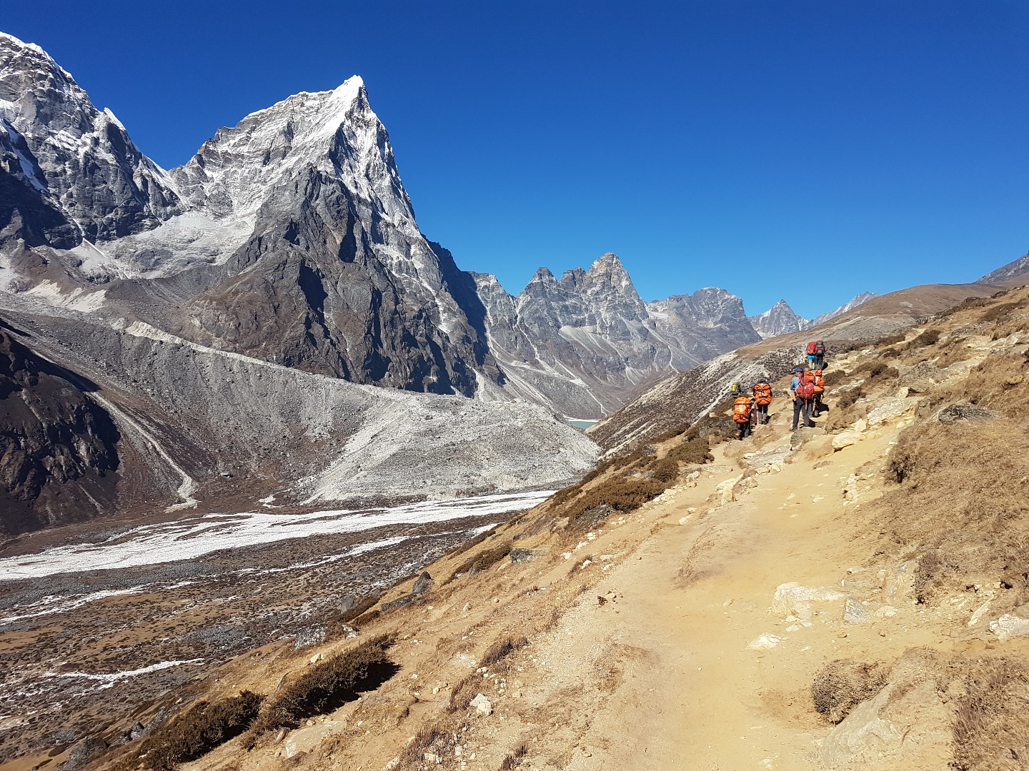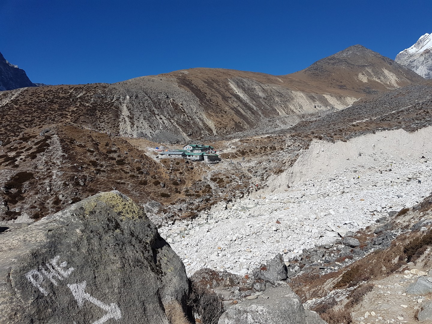 Thukla (4620 m) ist bereits zu sehen. Vorher müssen wir aber noch durch dieses steinige Nebental gehen.