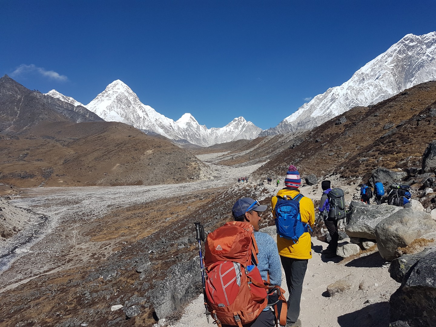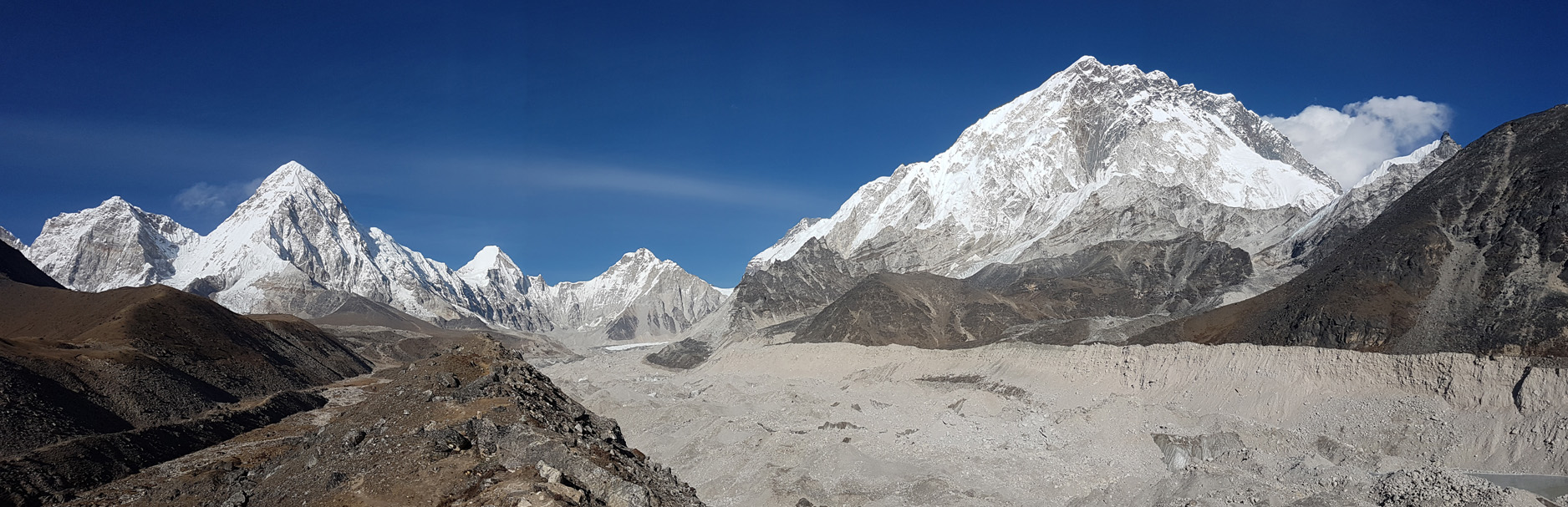 Ein phantastisches Panorama bietet sich von der Seitenmoräne des Khumbu Gletschers. Am Ende des Tals liegt das Everest Base Camp. Es ist nur zu erahnen.