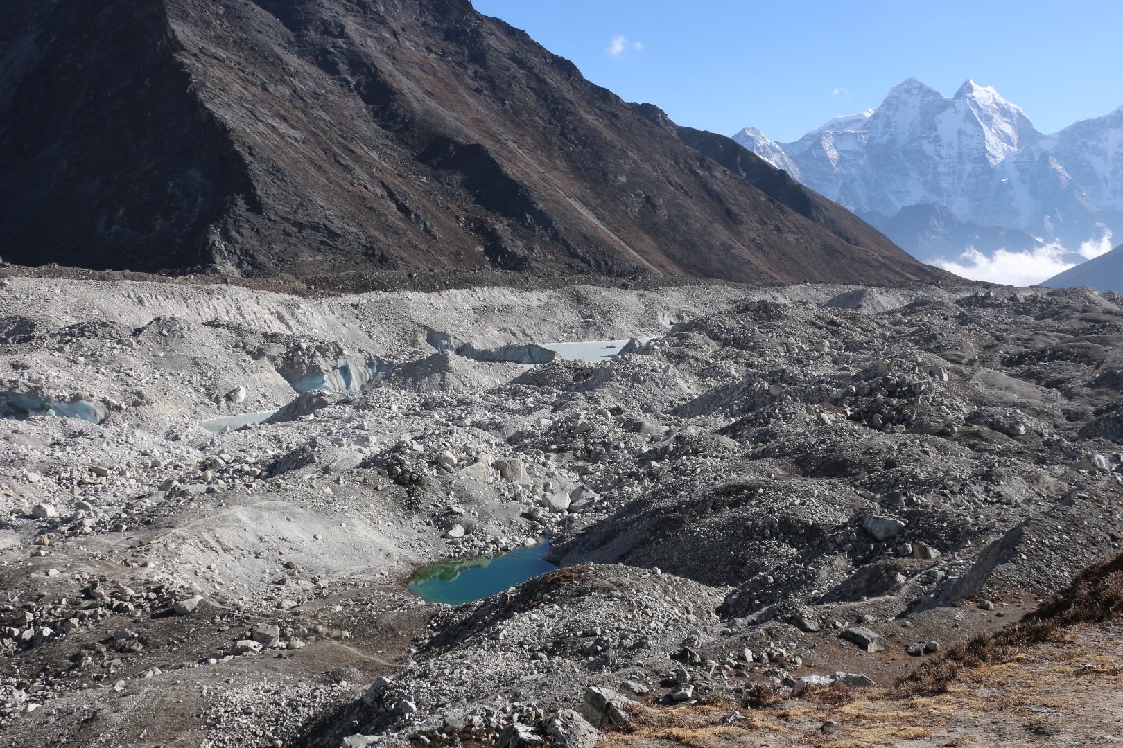 Der Gletscher erinnert mehr an eine Steinwüste als an Eis. Der Gletscher hat bereits bessere Zeiten gesehen. Auch die Gletscher in Nepal schrumpfen immer mehr.
