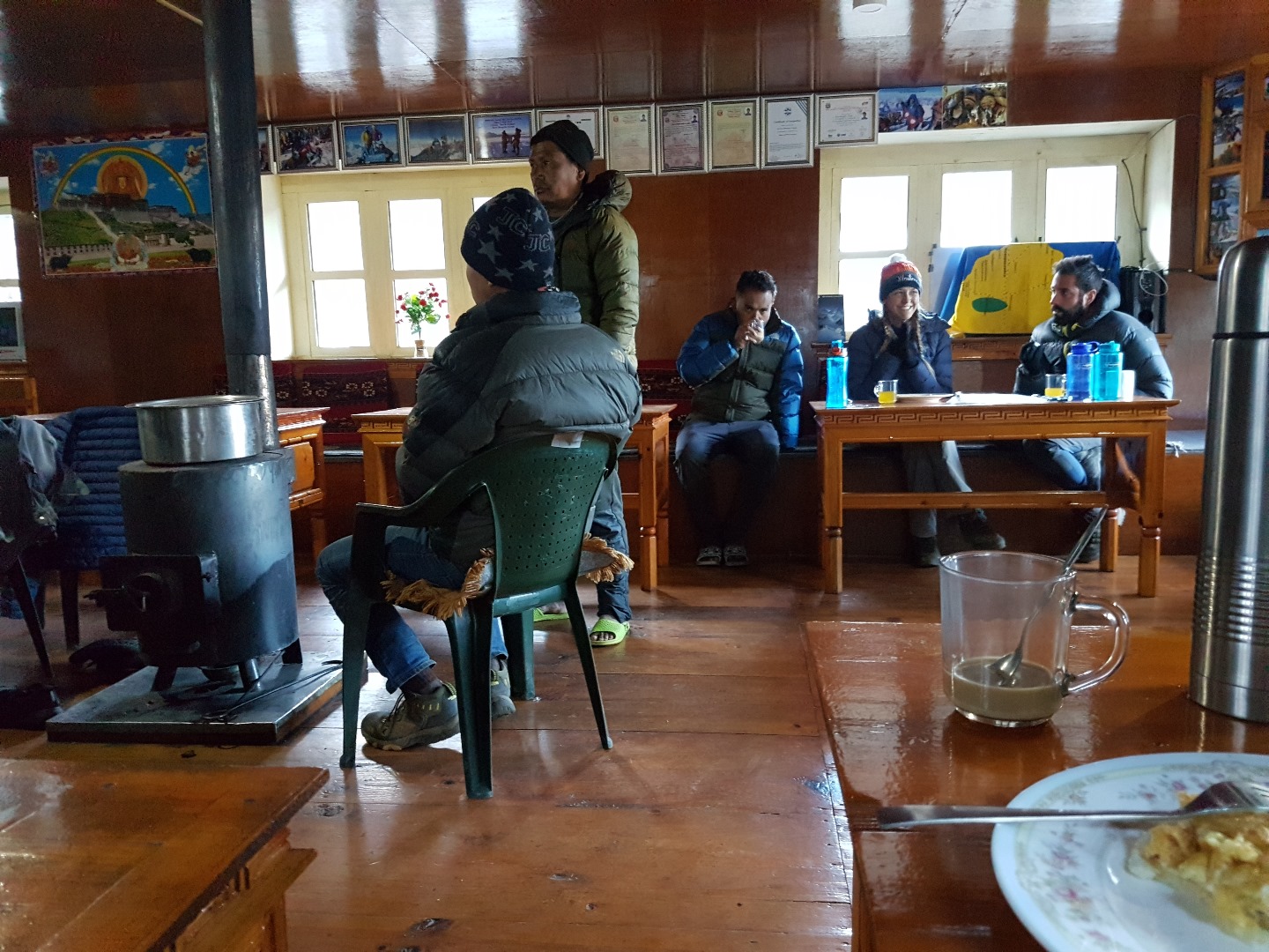 Frühstück in der Lodge. Hier ist es immer sehr kalt, aber Dank der Daunenjacken kein Problem.