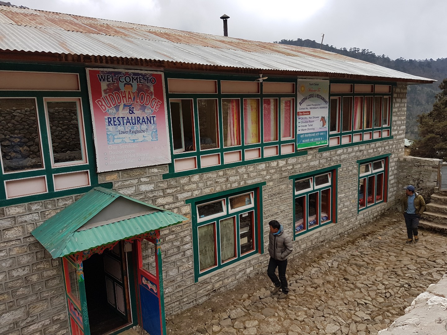 Unsere Lodge in Pangboche. Der Speisesaal ist im ersten Stock erkennbar am Schornstein für den einzigen Ofen.