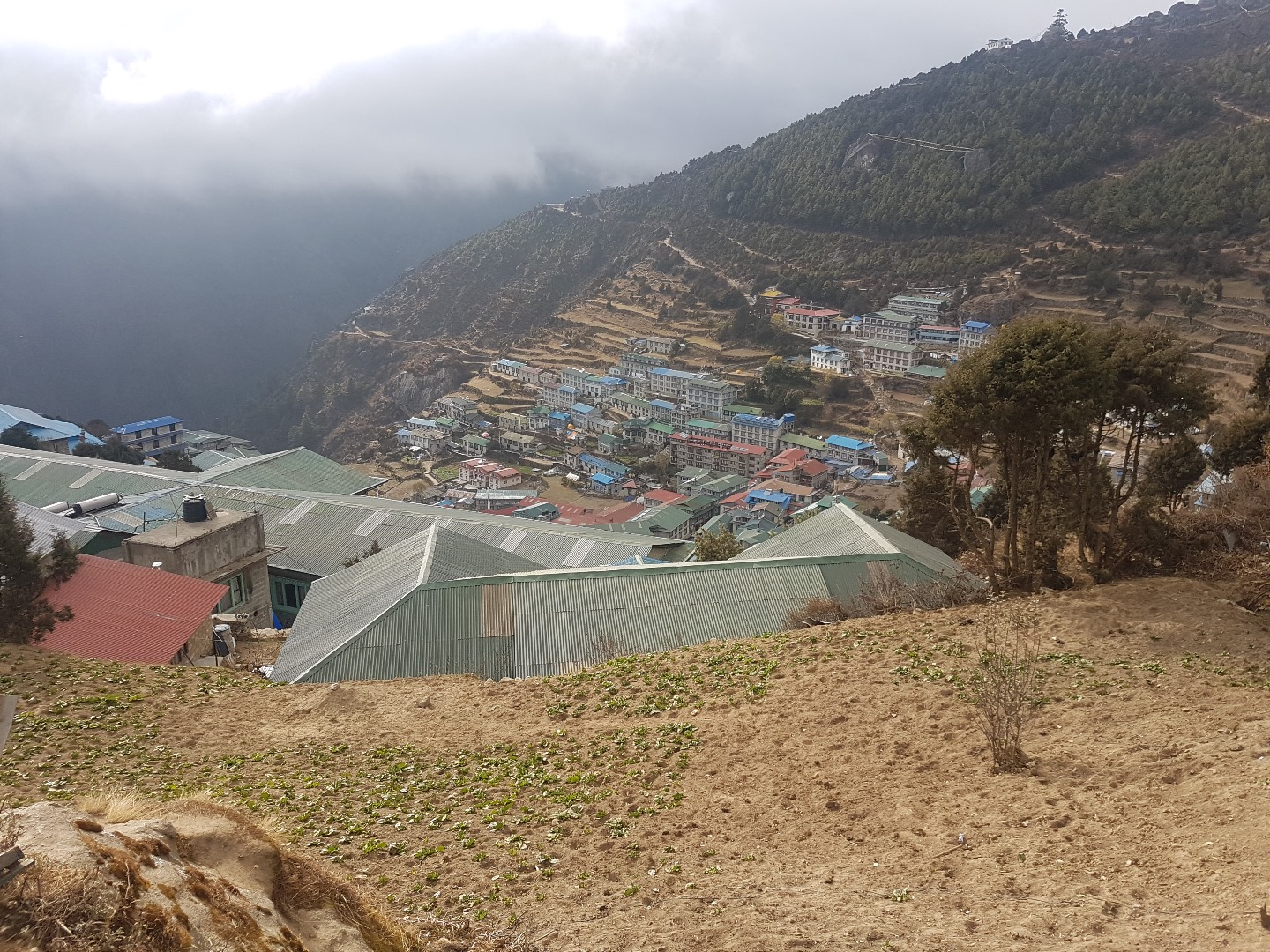 Namche Bazar vom Rückweg aus gesehen. Im Hintergrund ist der Weg nach Thame zu erkennen.