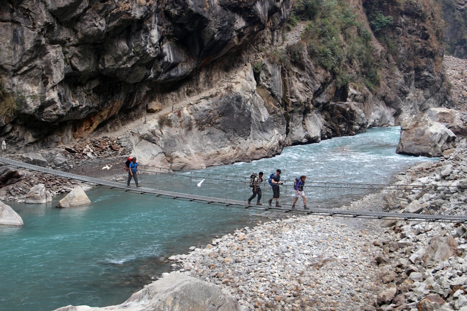 Eine der vielen Hängebrücken die wir auf unserer Tour nutzen. Sie sind alle in einem erstaunlich guten Zustand. Da weiter oberhalb der Pfad durch einen Erdrutsch zerstört war, mussten wir hier auf die Jeep-Piste ausweichen.