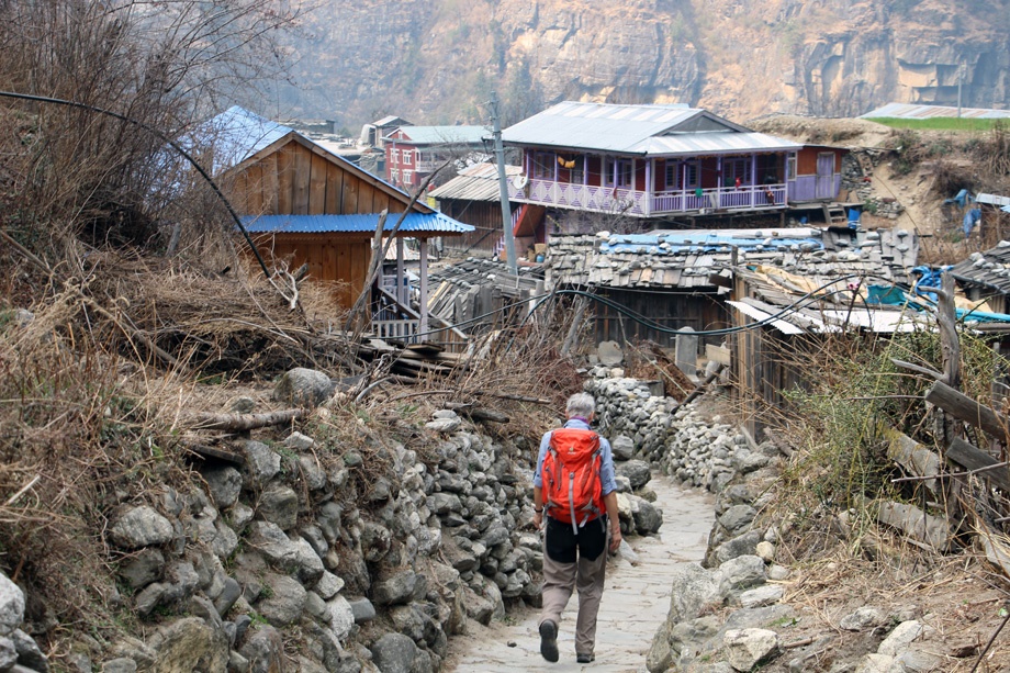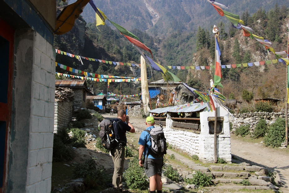 Anfangs verlief unser Weg entlang der Jeep-Piste. Hier passierten wir unter anderem das schöne Dorf Danageu mit den nepal-typischen Gebetsmühlen.