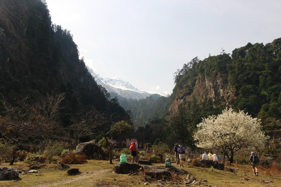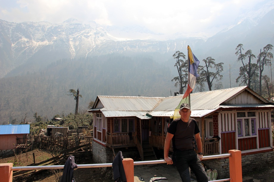 Unsere Mittagspause machten wir in Timang (2620 m), wo wir auf einer herrlichen Dachterrasse saßen und die gute Aussicht genossen. Im Hintergrund rechts stehen heilige Bäume, die schon sehr alt sind.