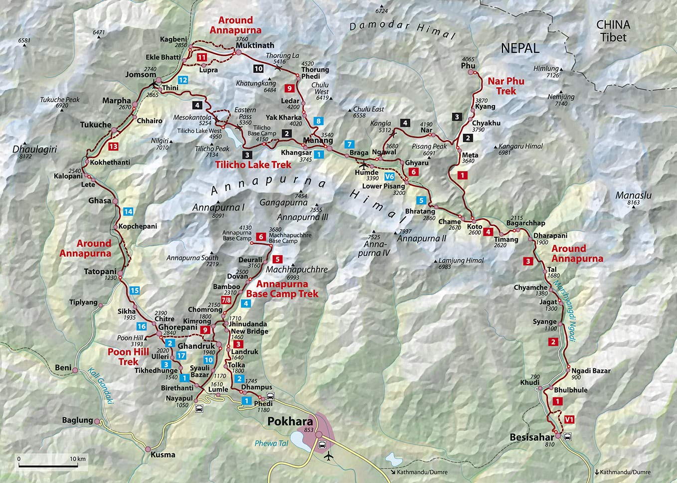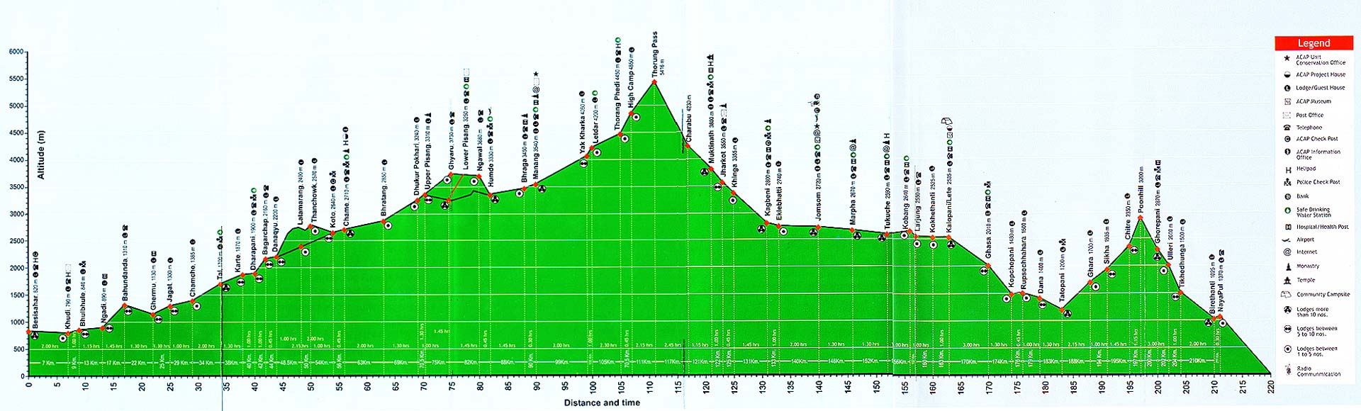 Wegverlauf: Bahundanda -> Jagat -> Dharapani -> Chame -> Uppder Pisang (über Ghyaru) -> Manang -> Chuli Ledar -> High Camp -> Muktinath (über Lupra) -> Jomsom -> Kalapani -> Tatopani -> Ghorepani -> Ulleri -> Nayapul