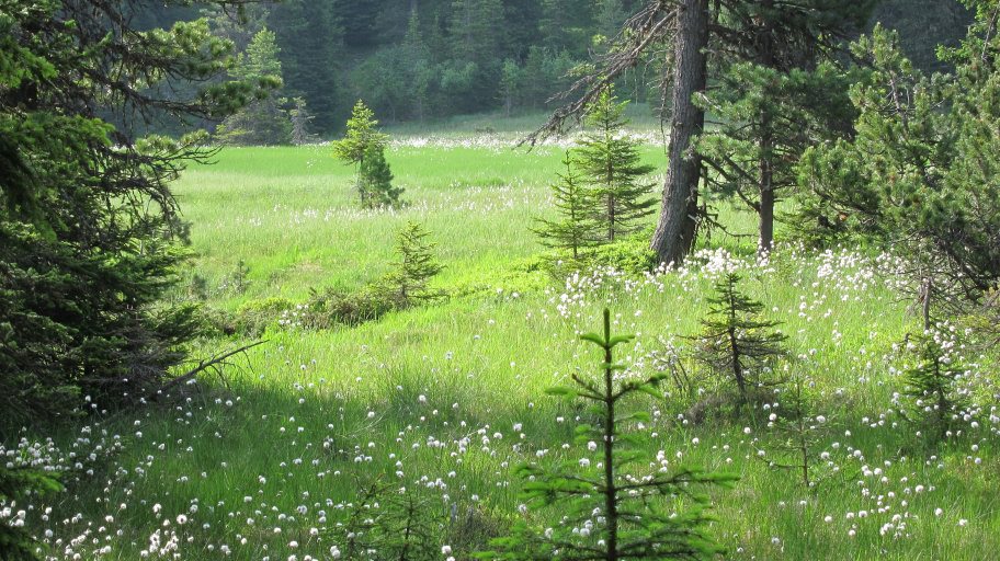 Auf einem einsamen Weg, wir begegneten keinen einzigen Menschen, ging es an einem Hochmoor vorbei.