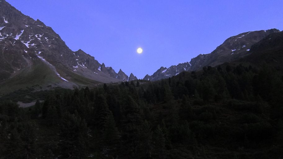 Reichlich 1,5 Stunden später erreichten wir dann endlich die Verpeilhütte. Aus dem Fenster unseres Quartier konnten wir den Weg für den nächsten Tag vom Mond beschienen sehen.