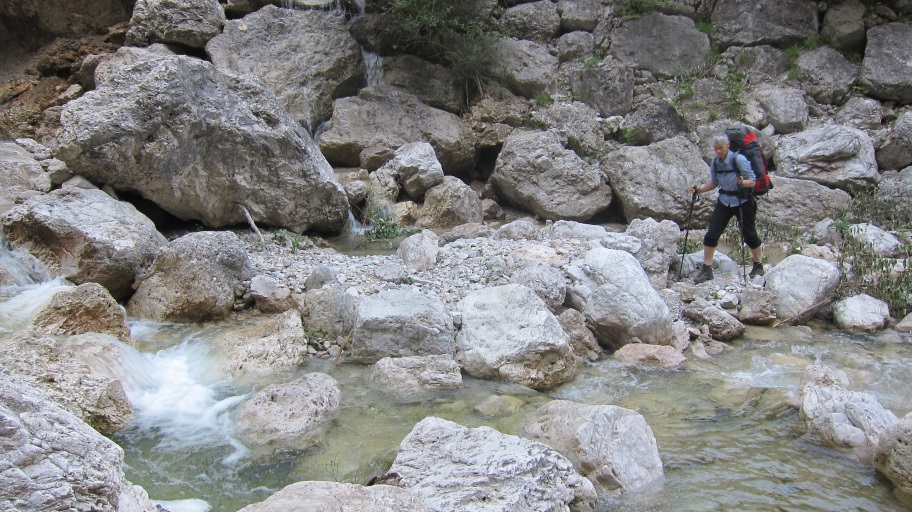 Nach einem guten Frühstück ging es erst über eine Landstraße zur Schlucht Val Scura. Durch diese Schlucht geht eine reizvolle Variante des E5 mit Klettereinlagen. Bei schlechtem Wetter und viel Wasser wird allerdings geraten lieber den Original-E5 Weg zu gehen, der auch eine Stunde kürzer ist.