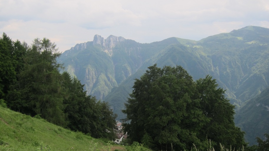 Nach der Schlucht verlief der Weg erst über eine Forststraße, dann kurzzeitig über eine Landstraße, die wir dann aber wieder verließen. Auf dem Foto ist Lusern, unserer Zielort bereits zu sehen.