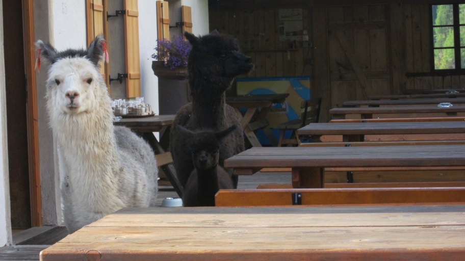 Auf der Hirzer Hütte waren wir abends die einzigen Gäste und bekamen besonderen Besuch von einer neugierigen Alpaka-Familie, die über die Terasse Ihr Gehege verließ.