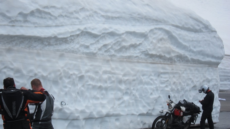 Die Motorradfahrer wirken richtig klein vor der Schneewand. Hier mussten die Schneefräsen ganze Arbeit leisten.